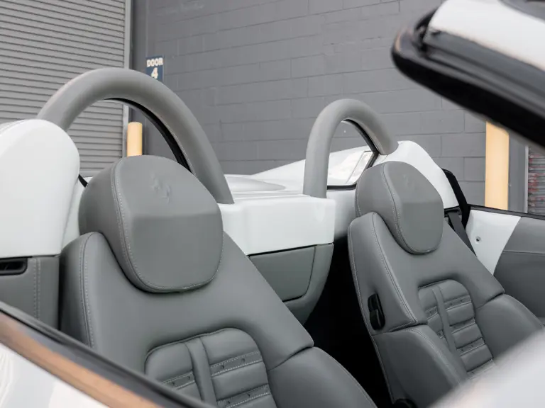 - Showstopping in Bianco Avus over gray leather with optional color-matched dashboard, steering wheel, roll bar, and stitching