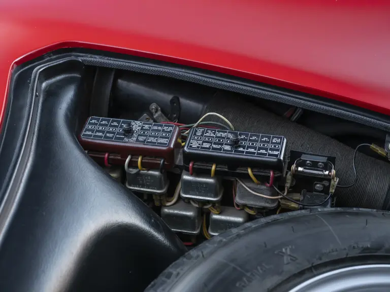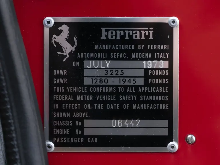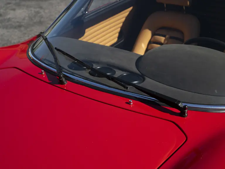 This Ferrari Dino 246 GTS, completed on 3 December 1973, is a highly desirable example built in the final eight months of production. Chassis 06442 left the factory finished in Rosso Chiaro over Nero. A Canada-market, left-hand-drive example, it was equipped with Daytona seats and fender flares to accommodate the Campagnolo wheels and tires, confirming its status as one of the very rare and desirable examples known colloquially as “Chairs & Flares.” Making it more desirable, it was also equipped from the factory with optional air conditioning and power windows.