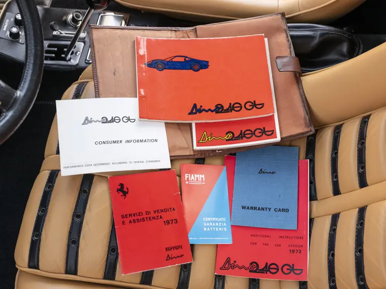It is believed that fewer than 200 Dino examples were built with the “Chairs & Flares” options out of a total run of nearly 4,000 units, elevating this car to the pinnacle of Dino production. Included in the sale are manuals with a leather pouch, tools, a Massini Report, and service invoices.