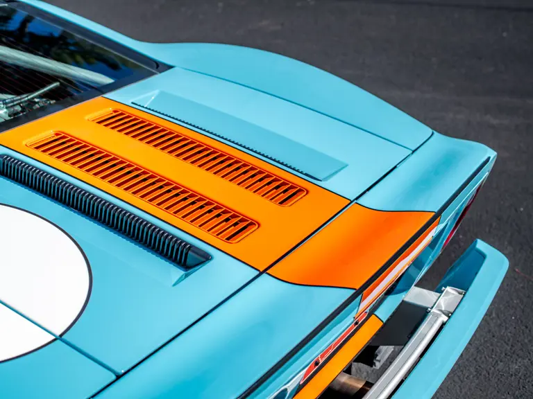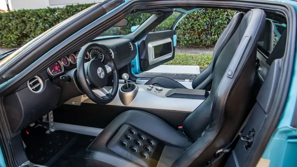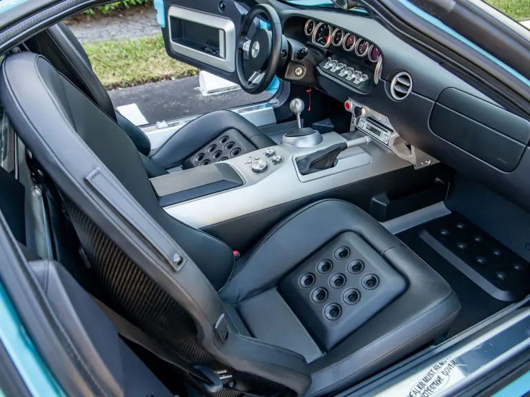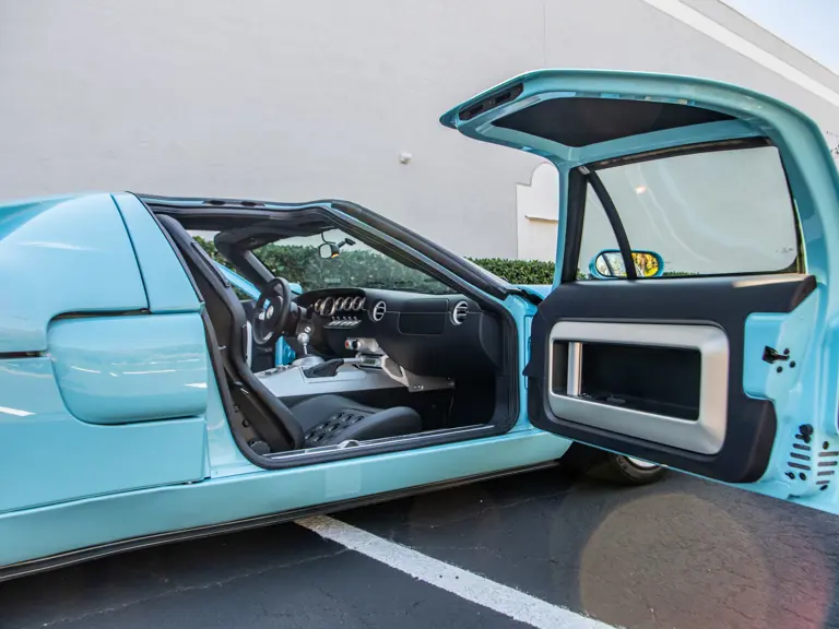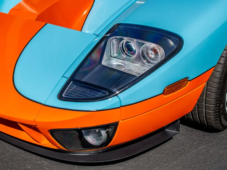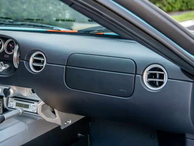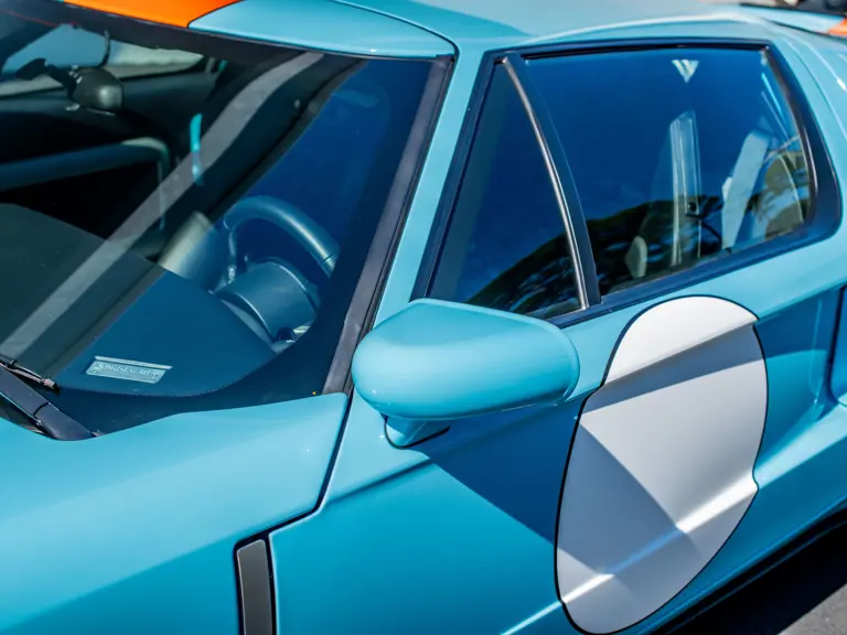 This Ford GT was built at Ford’s Wixom plant in August 2006. It left the factory outfitted with three options: Gun Metal Grey painted calipers, BBS forged lightweight aluminum wheels, and, of course, the Heritage livery finished in Heritage Blue with Epic Orange GT stripes with four white roundels. It was shipped to Circuit Ford Lincoln in Montreal, Quebec, Canada, and later sold new on 28 February 2007.