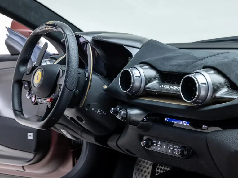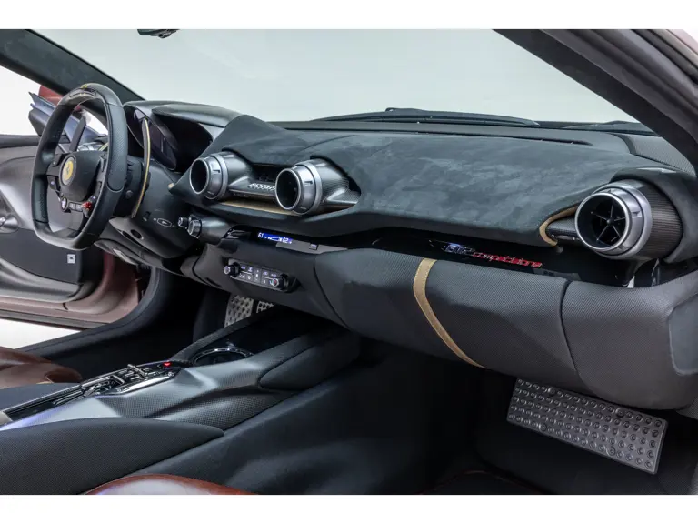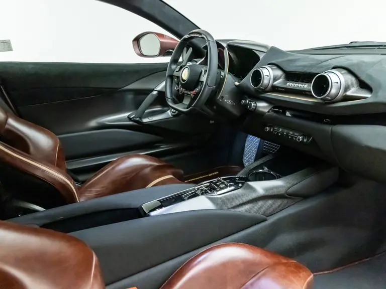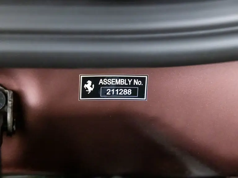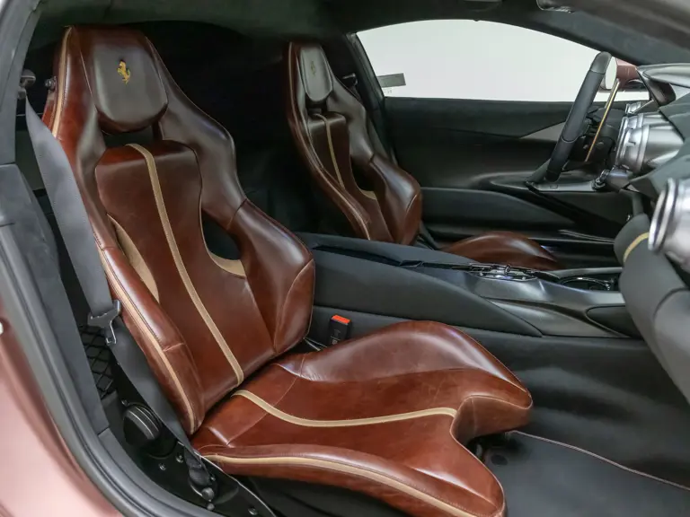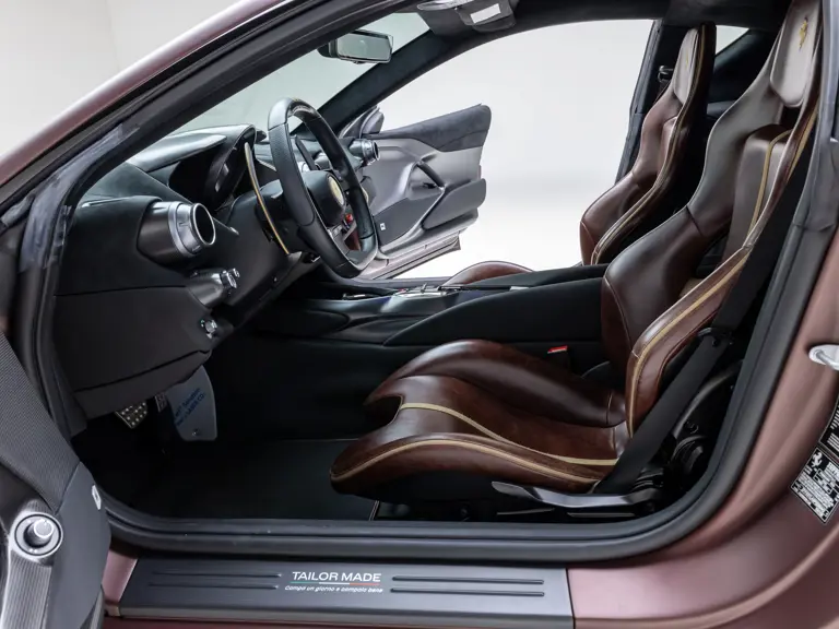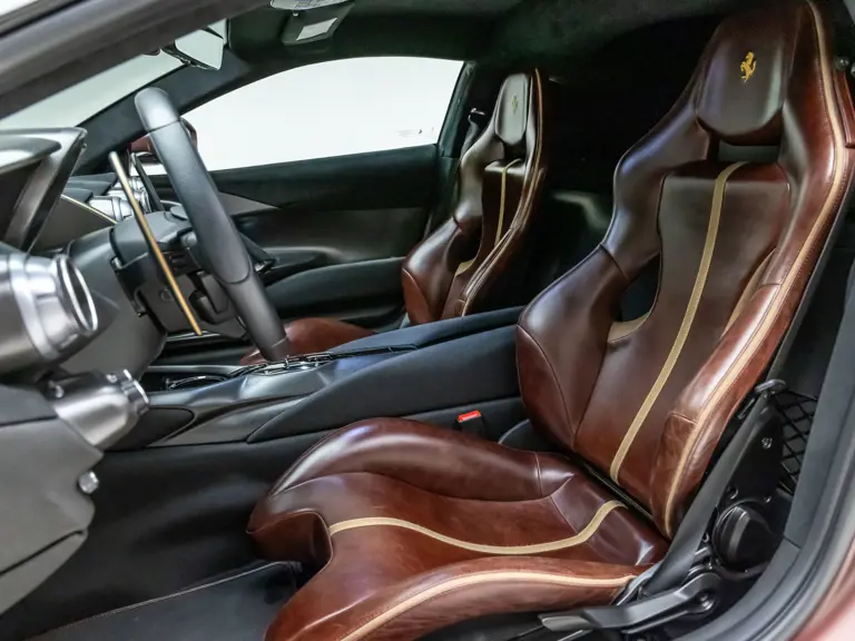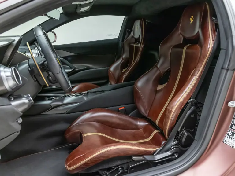 Delivered new via Ferrari of Tampa Bay, Florida, this Competizione wears extra-range Prugna Opaco exterior paint with a pair of longitudinal stripes in Oro Opaco. Scuderia shields are found on the fenders, and glossy black brake calipers sit behind Matte Gold forged racing wheels. One of the highlights of the interior is undoubtedly the Poltrona Frau Heritage Castagno leather selected for the racing seats (size medium), further detailed with extra-range colored stitching and embroidered Cavallino logos on the headrests. This very classic-looking material is also used for the luggage straps behind the two seats, as well as inserts near the door sills. The remainder of the cabin is trimmed in a combination of Nero Alcantara and carbon fiber; the exterior stripes are echoed on the top of the steering wheel, as well as Matte Gold Dreamlines on the paddle shifters.