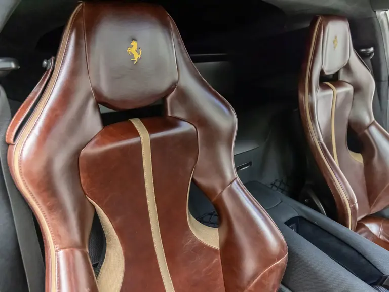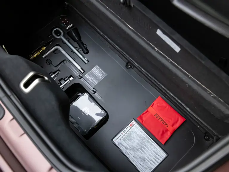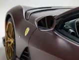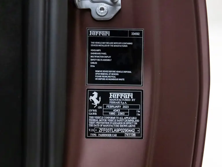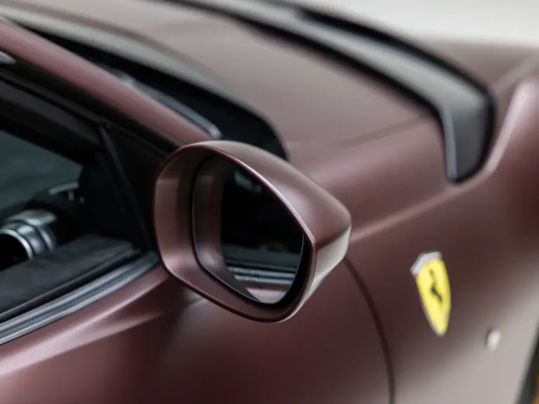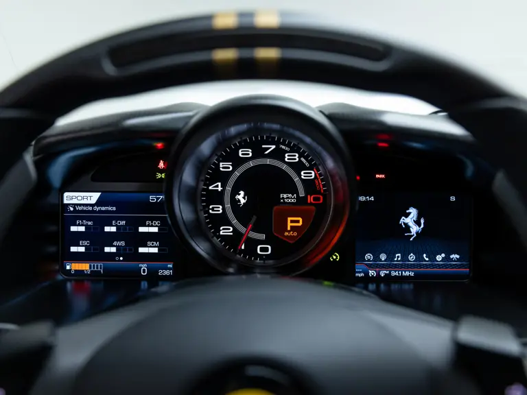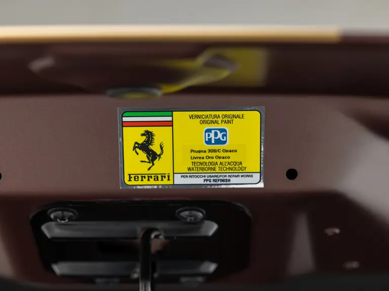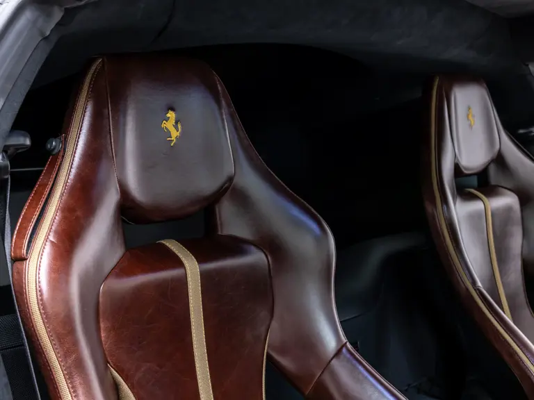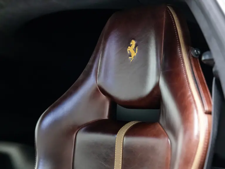 Delivered new via Ferrari of Tampa Bay, Florida, this Competizione wears extra-range Prugna Opaco exterior paint with a pair of longitudinal stripes in Oro Opaco. Scuderia shields are found on the fenders, and glossy black brake calipers sit behind Matte Gold forged racing wheels. One of the highlights of the interior is undoubtedly the Poltrona Frau Heritage Castagno leather selected for the racing seats (size medium), further detailed with extra-range colored stitching and embroidered Cavallino logos on the headrests. This very classic-looking material is also used for the luggage straps behind the two seats, as well as inserts near the door sills. The remainder of the cabin is trimmed in a combination of Nero Alcantara and carbon fiber; the exterior stripes are echoed on the top of the steering wheel, as well as Matte Gold Dreamlines on the paddle shifters.