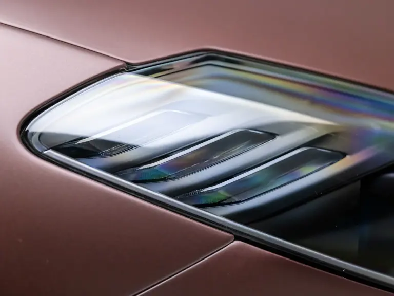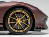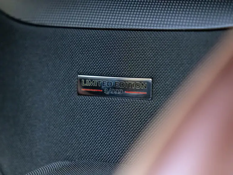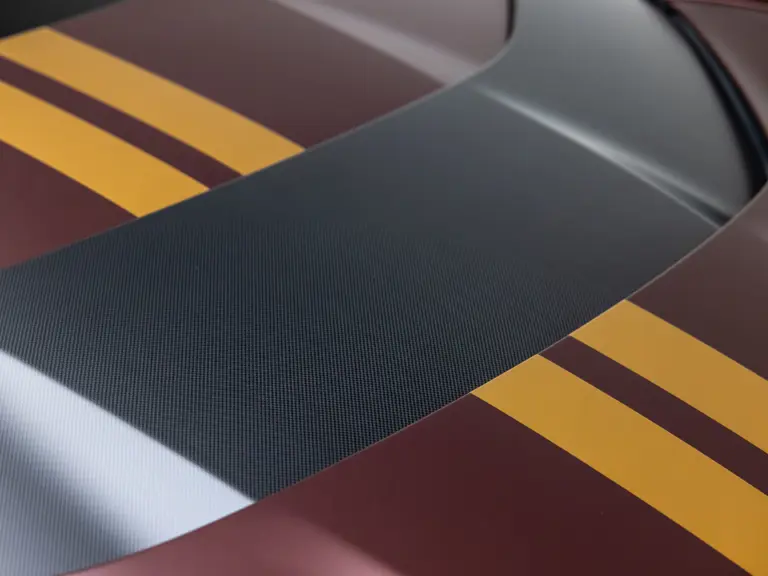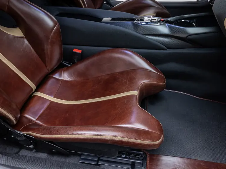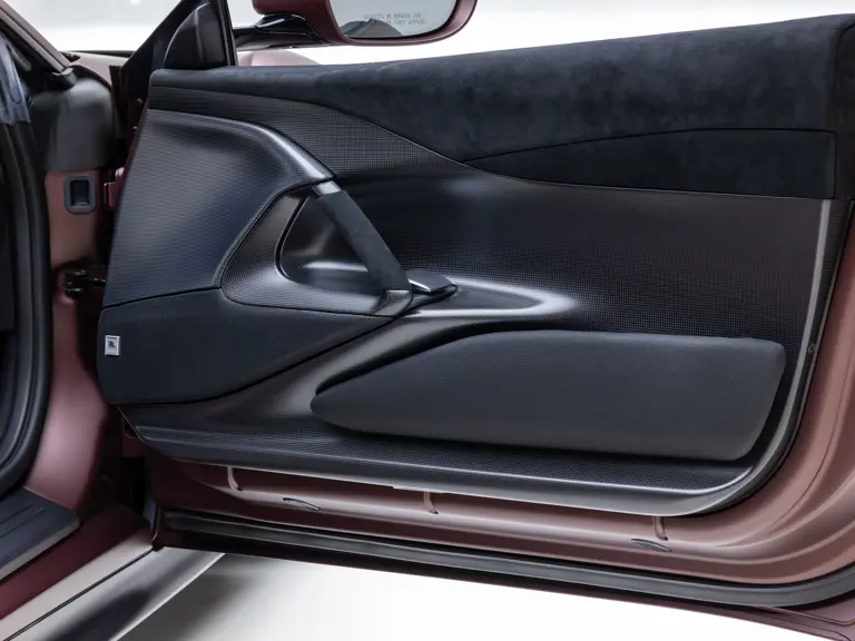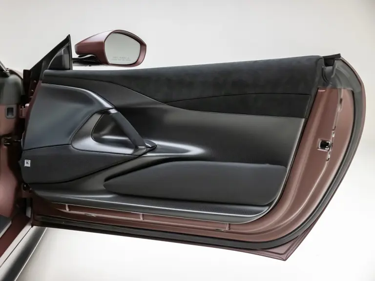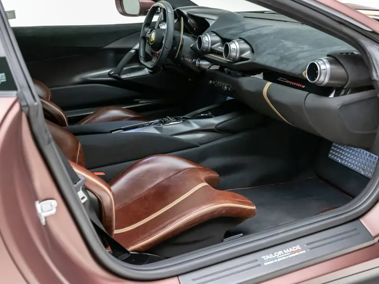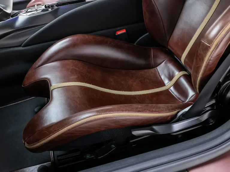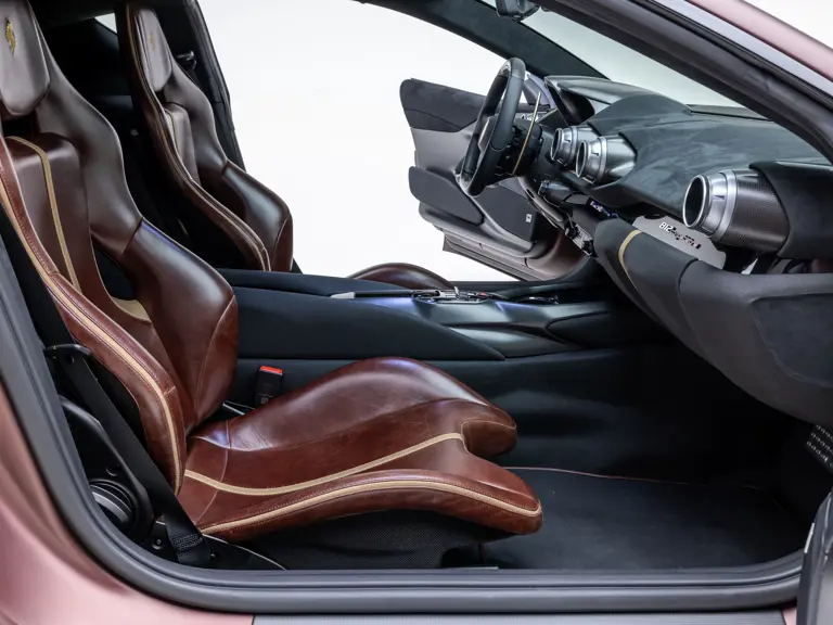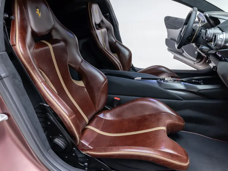 - Striking extra-range Prugna Opaco exterior with Oro Opaco stripes over Poltrona Frau Heritage Castagno leather and Nero Alcantara interior