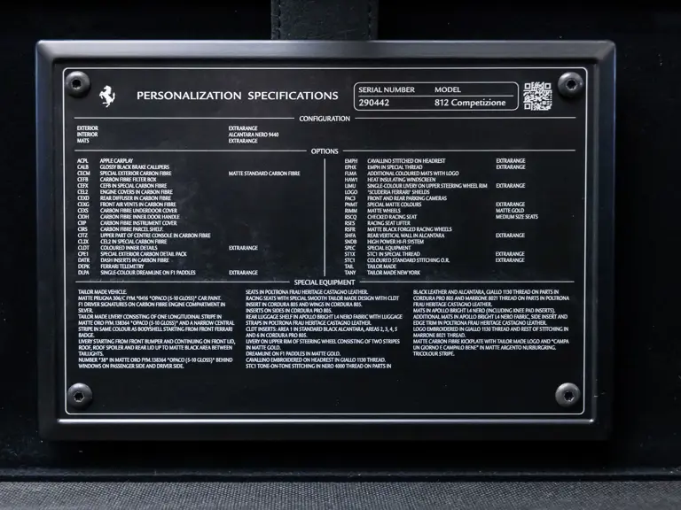 Highly sought-after from the moment of its unveiling, the 812 Competizione is a connoisseur’s Ferrari, celebrating the marque’s unfiltered performance pedigree and representing a thoroughly modern interpretation of Maranello’s storied history of naturally aspirated V-12 excellence. This example, with its remarkable Tailor Made specification, subtle details that reference Ferrari’s racing history, and a record of limited use, stands as one of the ultimate expressions of a model destined to be a landmark in Ferrari history.