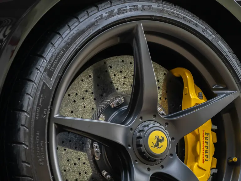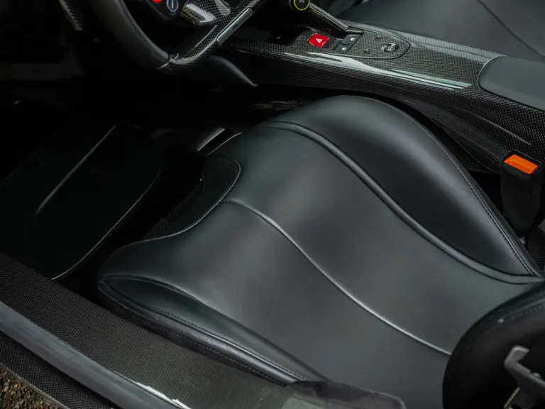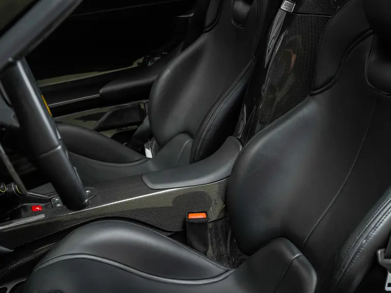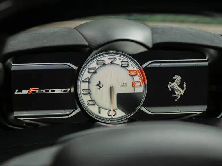 Ferrari’s in-house designer Flavio Manzoni penned the coachwork, which is beautifully low-slung and sleek while eschewing the brutal and somewhat angular styling of the Enzo. Electronically deployed active aerodynamic elements, including “smart” front and rear undercarriage panels, and a rear spoiler continuously provide downforce from between 200 and 800 pounds to maintain the car’s traction and composure at any speed. Mammoth cross-drilled and vented Brembo carbon-ceramic disc brakes and proprietary Pirelli P-Zero Corsa tires complete the technical profile, keeping the LaFerrari grounded through screaming switchbacks.