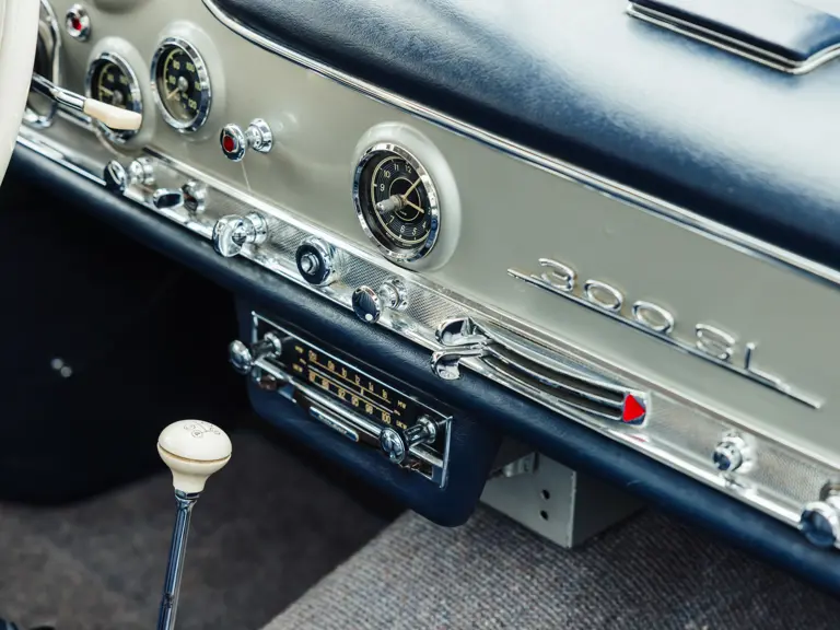 L'esemplare qui proposto con numero di telaio 198.040.6500223 fu appositamente ordinato ed equipaggiato da nuovo con ha un rapporto al ponte di 1:3.42. Inoltre, in origine era verniciato nella tonalità Blue Grey (DB 166) con interni in pelle Grün (L3), una combinazione di grande impatto e rarità. I registri indicano che fu una delle sole quattro Gullwing consegnate in questa tinta.