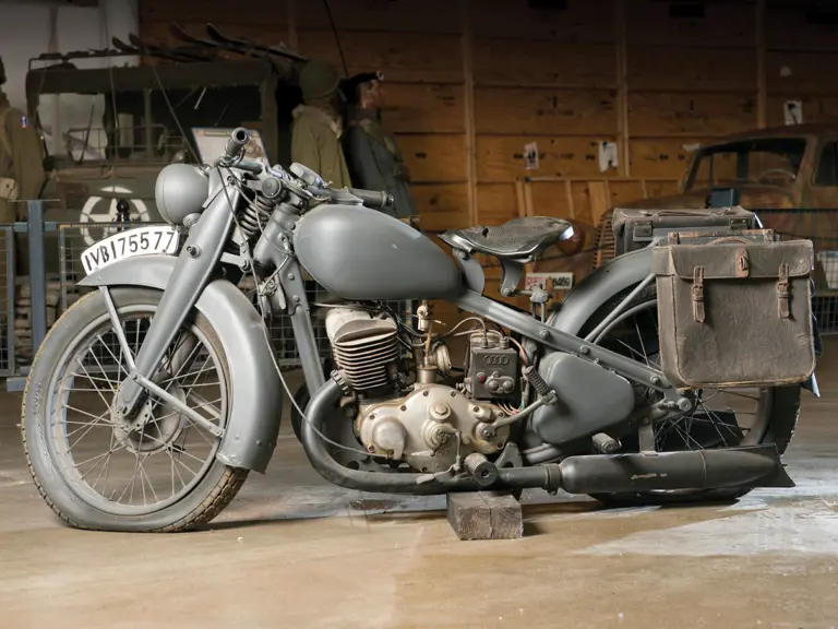 The DKW 500 was used by the German Army in World War II in both militarized versions and, as displayed, purchased civilian versions. DKW became famous for producing successful racing motorcycles during the 1930s. The DKW 500 was much less common than the 125-cc, 250-cc and 350-cc models, particularly the 125-cc and 350-cc models which were produced in large numbers until the end of the war. The DKW was the only 500-cc two-stroke motorcycle used by the German Wehrmacht (military) in World War II. The engine unit was a parallel-twin with 64-mm x 76-mm dimensions for its slightly inclined cylinders. A single carburetor at the rear supplied both cylinders and each had its own low-slung exhaust system. The four-speed gearbox was built into the crankcase and provided the rider with the option of gear change by foot or the more traditional and common hand unit positioned on the right side of the fuel tank. The frame was constructed from channel section steel pressings with plunger rear suspension. The front forks were the same blade girder design as the smaller DKW motorcycles. A passenger seat was sometimes added. Some DKW 500s were built with sidecars. The civilian DKW 500 solos were well-liked by the German troops.