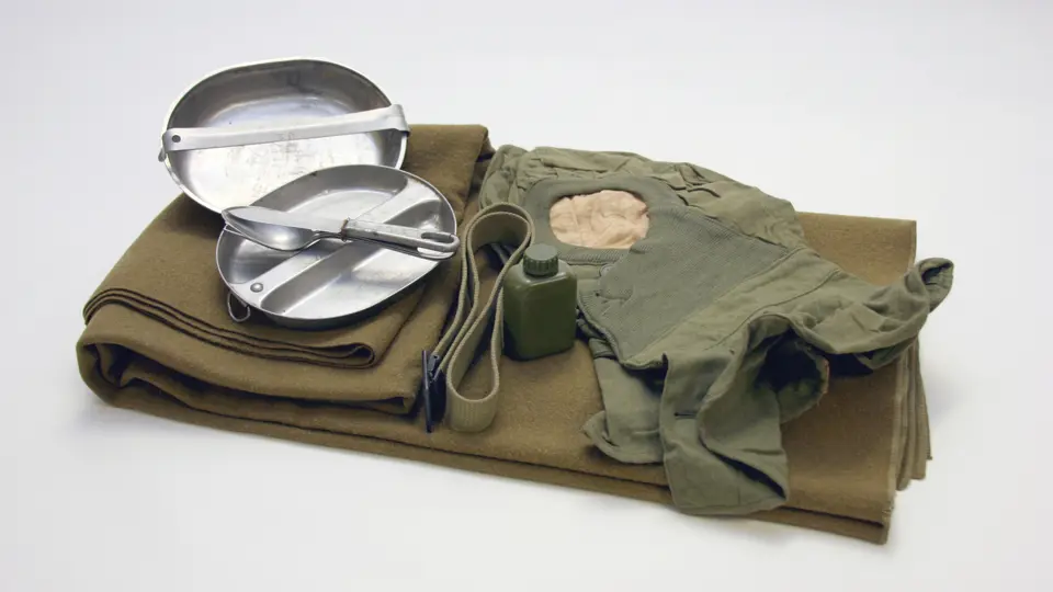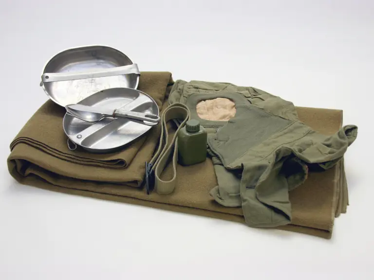 Army mess kit (1965) with complete knife, fork and spoon; green army blanket; green field belt with black buckle; wool parka (unissued WWII June 1, 1942); green plastic bottle