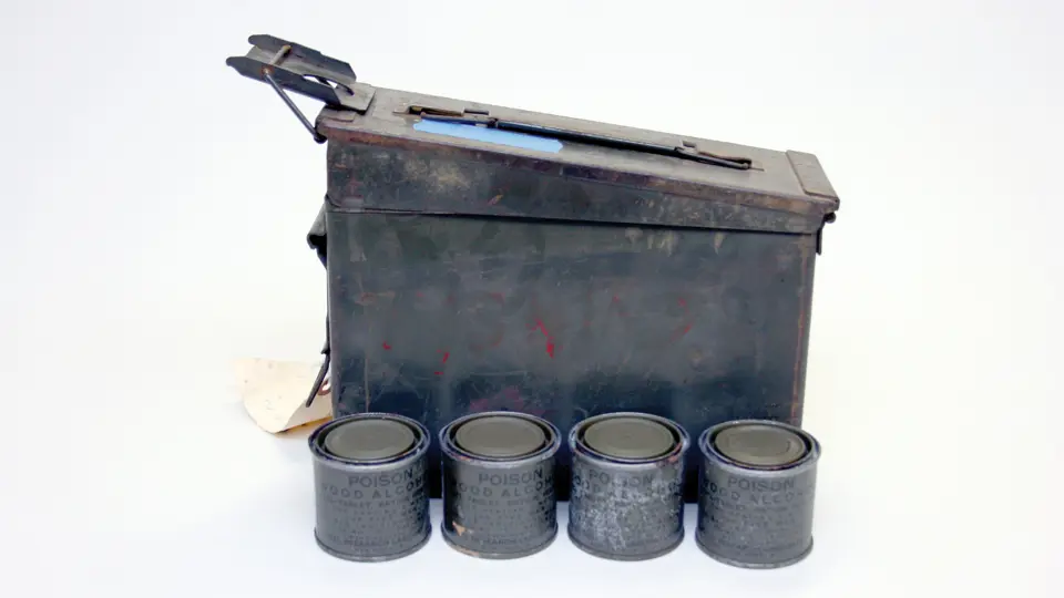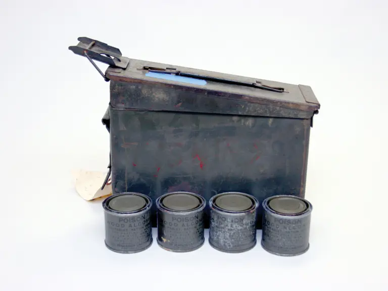 Wood alcohol fuel burner with cans of fuel, in metal locking case