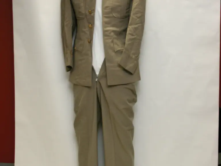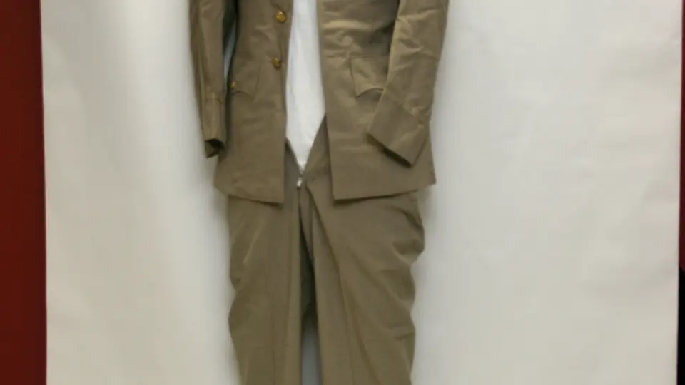 Tan US Army dress uniform with brass eagle buttons