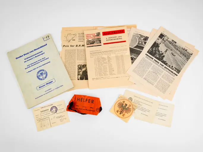 1962 German Grand Prix Folder, Scrutineering Card, Armband and Documents