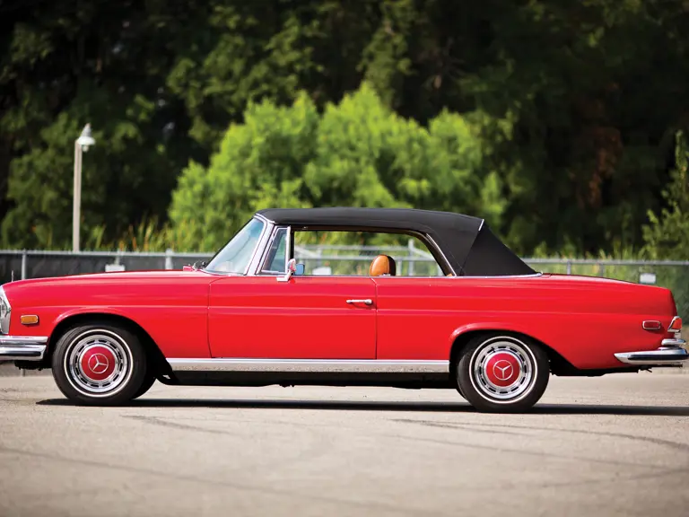 In 1968, the “New Generation” of upscale Mercedes-Benz models (S-Class) debuted. These carefully refined five-passenger automobiles continued a tradition of handcrafted quality and superior engineering, while their formal styling remains a design benchmark. The Cabriolet’s padded folding top required 16 hours of hand labor to complete, while its chassis featured advanced design and structural reinforcements providing immense rigidity and safety.