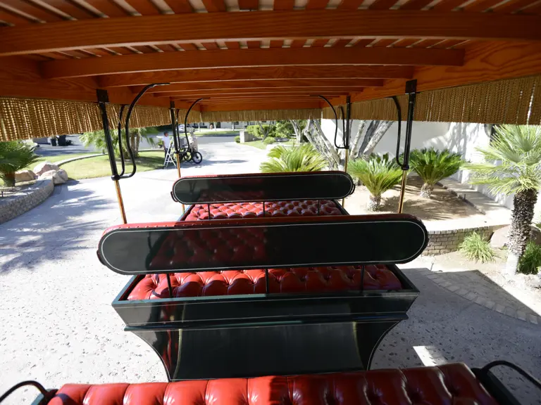 Outfitted as the “Official Centennial Mayor-Mobile” for the 2006 city parade in Las Vegas, this smart, Rapid Nine-Passenger Omnibus presents exceptionally well, with a dark green body over a bright red chassis and wheels. The seats are red buttoned leather, shaded by a fringed surrey top. Highly-polished brass Solar headlamps, steering column, and hubcaps provide delightful visual highlights. Solid rubber tires guarantee freedom from punctures.