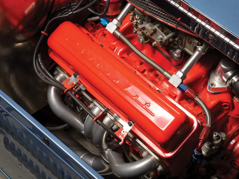 The engine was assembled by LJ’s Speed Shop in Napa and had 10:1 compression, wet-sump lubrication, stainless steel headers and exhaust, and a Holley 650 four-barrel carb with Mallory ignition. Street rod builder Roy Brizio prepped and painted the body, which has a fiberglass rear tub with aluminum doors, cowl, and nose. White-on-black Stewart Warner instruments grace the simple dashboard. The jaunty windshield is a custom creation, made by modifying a screen intended for a 1932 Ford “Deuce” hot rod.