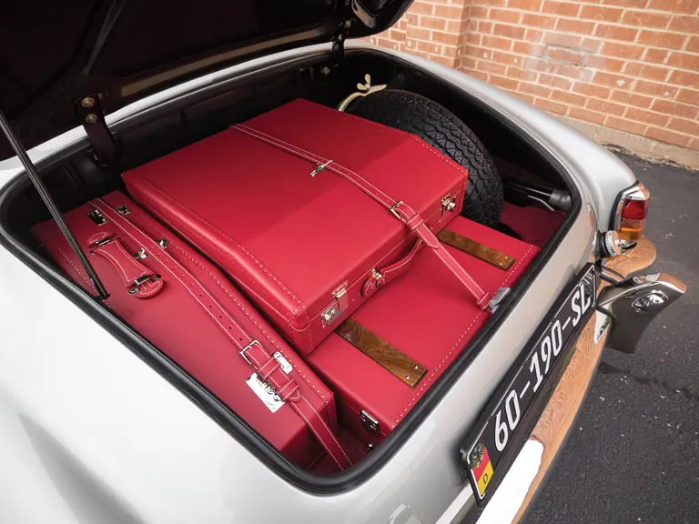 The example offered here was produced in 1960 for sale in the U.S. and was originally finished in Medium Blue over Ivory upholstery. After a minor fender-bender dented the left front corner, the car was evidently parked until being purchased by a previous owner. It was subsequently shipped to Eastern Europe for a complete restoration. There, craftsmen properly trained in bodywork using leading rather than plastic body filler expertly repaired the fender. The car was stripped to its unit chassis, with bodywork done on an alignment jig, using Mercedes-Benz panels to repair the limited damage, as documented in an extensive picture file. Then, the car was mounted on a rotisserie for finish preparation and painted in the classic Silver-Grey (DB180) paint correct for that model year.