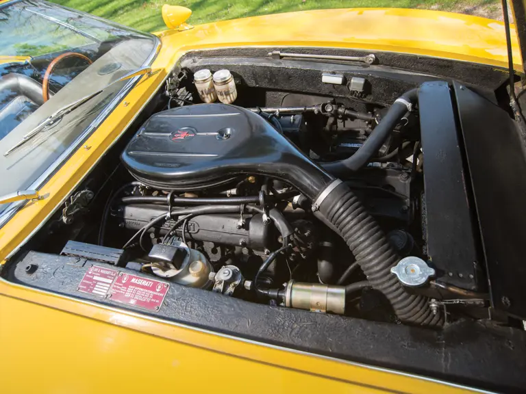 While the production Ghibli Spyders that followed closely resembled chassis 1001, there are a number of subtle differences that make this prototype stand out from the rest. Perhaps the most noticeable of these are the recesses in the door panels where the door handles are mounted on chassis 1001. Also, the external fuel filler doors found on the rear deck of the production cars are not present on chassis 1001. While this enhanced the lines of the car, the filler caps can only be accessed by opening the boot. In addition, the boot lid is longer on chassis 1001 than on the production spyders that followed, and it has a character line added to stiffen the lid. Other differences include mounting the radio antenna at the rear of the fender, a trunk-lid release lever that operates inversely to that on production Ghibli Spyders, and Maserati and Ghibli badges located on the driver’s side of the rear fascia rather than split, as found on the production spyders. Additionally, the cylinder heads on the engine have extra impressions to allow for twin-spark ignition for each cylinder, a configuration found on early versions of the 4.7-liter engines, although none were ever thus equipped.