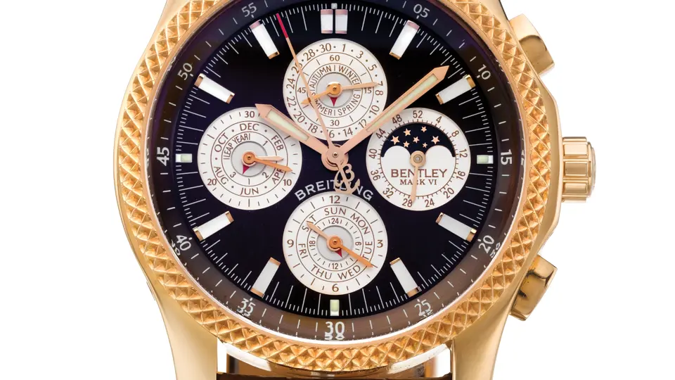 Cal. 2892 automatic nickel lever movement, 38 jewels, chocolate dial, baton indexes, luminescent dots and hands, silvered subsidiary dials for constant seconds combined with date and the seasons, 30-minute register combined with month and leap year, 12-hour register combined with day and 24-hour indication, moon phases with ages of the moon, 18k pink gold case, pushers and correctors to the band, sapphire crystal, screw down case back, case, dial, and movement signed, with an 18k pink gold Breitling folding buckle.
