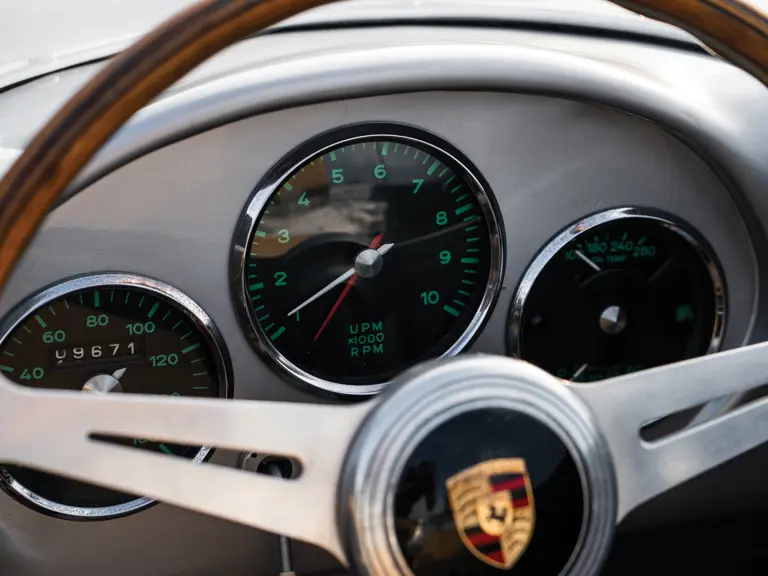 Chassis 550A-0116 was acquired by Japanese collector Hui Takahara in 1993, and he subsequently shipped the car to Germany for a complete overhaul and restoration at the shop of Manfred Friesinger. The car was restored to period configuration with the updated and more aerodynamic version of the nose that was offered by Porsche and was installed in 1959. Carl Loch built a fresh four-cam motor to replace the original (no. 90109). The car was then sold to its current owner in 2013. This historically important Porsche was then displayed at the Amelia Island Concours d’Elegance in 2014, where it was awarded Best in Class.