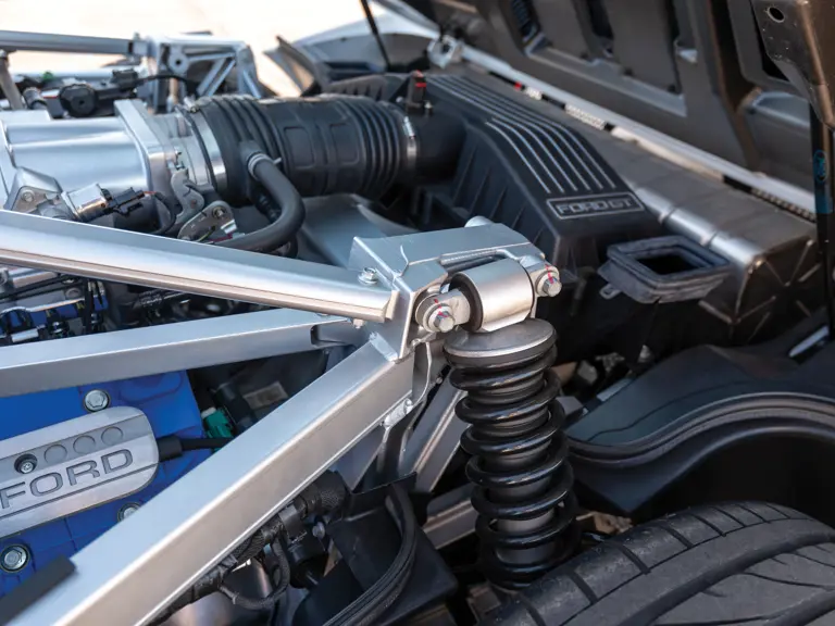 The Centennial White Ford GT offered here is a particularly clean, low-mileage, well-cared-for example. It is equipped with all four factory options, including grey-painted brake calipers, a full complement of blue racing stripes, attractive lightweight forged BBS wheels, and the upgraded McIntosh sound system. Powered by the requisite 5.4-liter aluminum supercharged V-8 with dry-sump lubrication system and backed by a six-speed manual Ricardo transmission, the car can sprint to 60 mph in less than 3.5 seconds and achieve a top speed of 205 mph. With braking and handling performance to match, this GT is without question one of the finest American sports cars of the last 50 years.