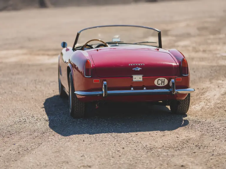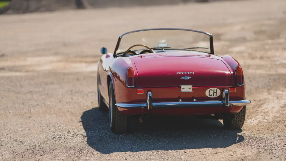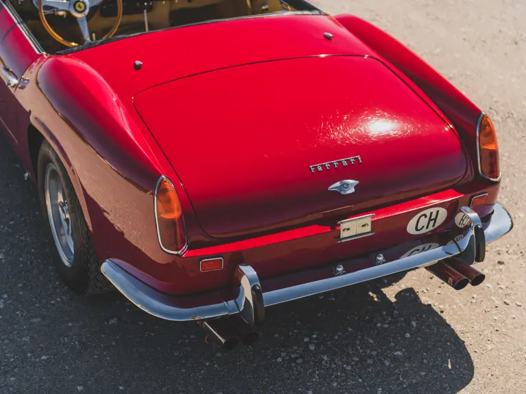 Completed by the factory on 28 December 1962, chassis 4131 GT was the 55th of the 56 SWB California Spiders produced and was equipped as a road car with steel bodywork, open headlights (one of 19), front bumper guards, and the features of “teardrop” side-marker lights and the latest tipo 168/61 engine. Finished in Rosso (10593), an elegant, slightly darker shade of red, with a beige leather (VM 3218) interior, it was delivered new by the famous official Ferrari dealer Automobile Monteverdi AG of Binningen-Basel, Switzerland, and first registered for the road in that country on 19 February 1963, as seen in Roger Gloor and C.L. Wagner’s Monteverdi (p. 122). Its original owner was John Amborn, also of Binningen. Unique to Swiss market cars, 4131 GT was provided with a dual horn system (country/city) and was also required to have a side mirror installed on the driver’s-side fender.