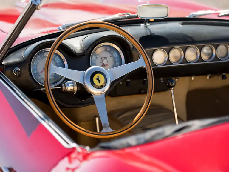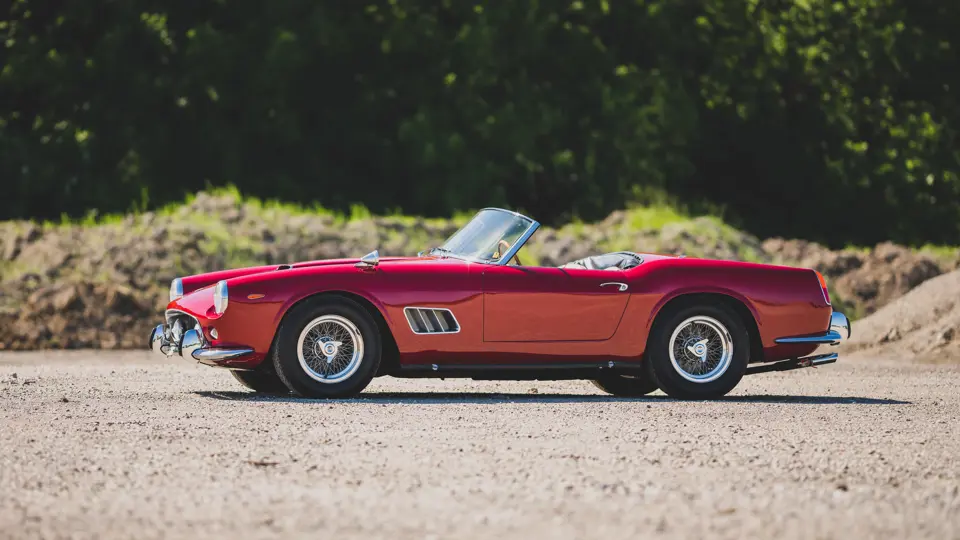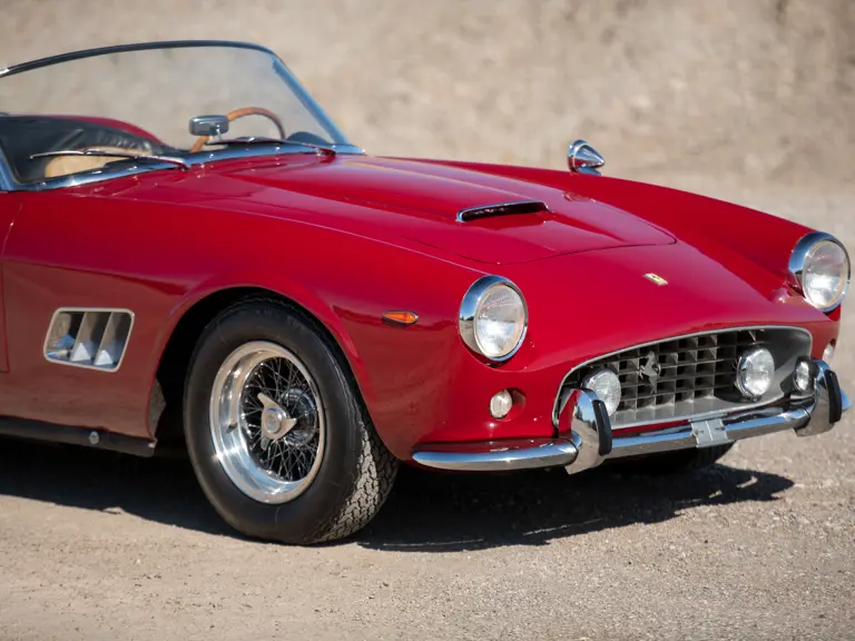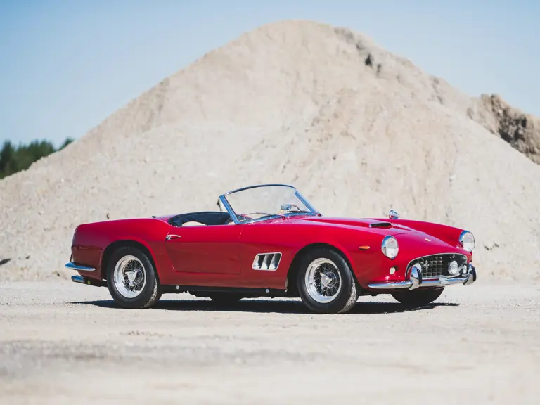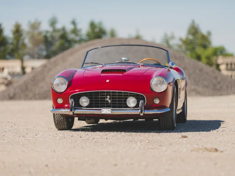It is a cliché to say that a special automobile needs no introduction—but the Ferrari 250 California, an open-top machine offering space for two people and their luggage on a performance-bred chassis, truly meets that criteria. Originally engineered as a convertible version of the 250 GT berlinetta “TdF,” it proved a tremendous success and was continued on that model’s short-wheelbase (SWB) successor chassis, now measuring 2,400 mm between the axles. The engine of this upgraded model was the newer Tipo 168 design with new heads and larger valves, reportedly capable of up to 280 horsepower. The track was widened, new Koni adjustable and telescopic shock absorbers were fitted, and the brakes were upgraded to Dunlop discs at all four wheels, providing transformative handling abilities.