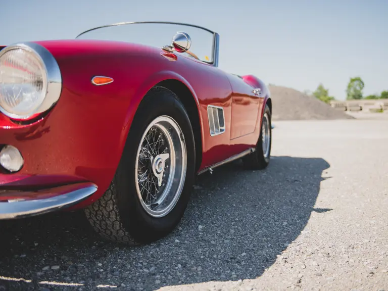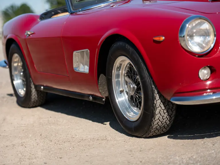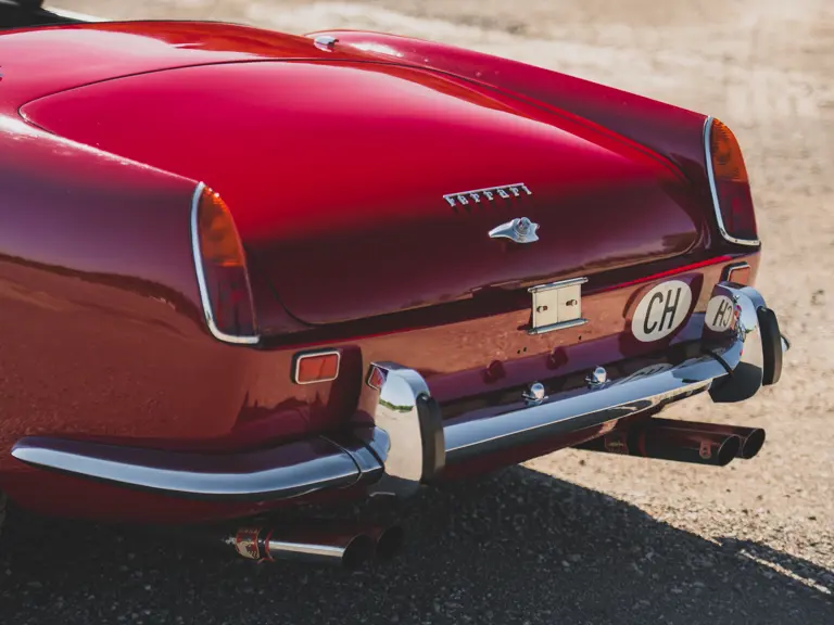 Celebrities such as Alain Delon, James Coburn, Peter Helm, Briggs Cunningham, Johnny Halliday, and Roger Vadim owned SWB California Spiders, but the car was happiest at high speeds, not purring around Beverly Hills. This was a car whose owners could and did drive it to the track, race it, and win—and then drive it home. One of the cars was campaigned by Jan De Vroom in the 1960 24 Hours of Le Mans and the 1961 12 Hours of Sebring, finishing 12th overall and 3rd in Class in the latter—a remarkable result for a street-legal convertible running against purpose-built racing machines. A handful of other examples competed in the Targa Florio and a variety of other European hill climbs and sports car races in the U.S., thereby cementing the California Spider’s place in Ferrari history as one of the great dual-purpose GT cars.