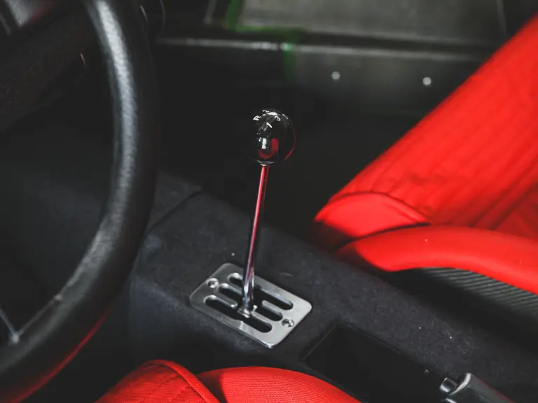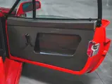 In the tradition of race car construction, great effort was taken to minimize weight. The coachwork was formed from a lightweight weave of Kevlar and carbon fiber that reduced curb weight substantially compared to the 288, all while tripling structural rigidity. Reduction of mass also extended to the interior, which featured cloth upholstered plastic-composite racing seats, pull-strap door releases, drilled pedals, and sliding Perspex windows in the early cars (roll-up windows, like those fitted to this car, were eventually incorporated).