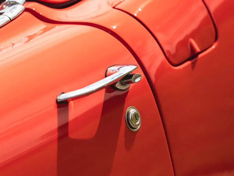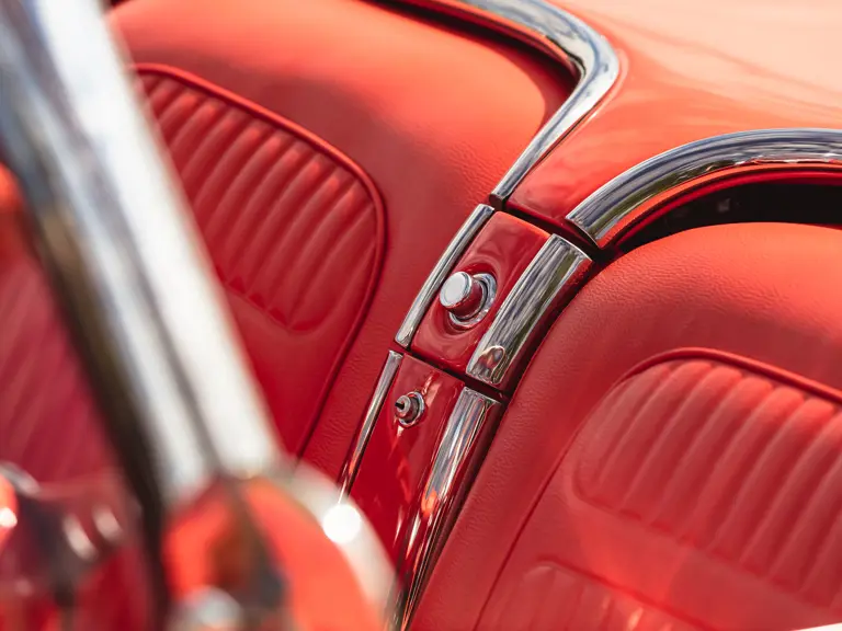 This Signet Red “Fuelie” with white coves may be among the most awarded of its kind, and it is decked out with many desirable options. It is recorded that 1,399 of the 9,168 Corvettes built in 1958 left the St. Louis, Missouri assembly plant finished in this hue, which works especially well with the red “pebble grain” vinyl interior and white soft top. Options include, naturally, fuel injection, along with a four-speed manual transmission, the distinctive Wonderbar signal-seeking AM radio that debuted for 1958, power windows, heater, and 15-inch wheels with whitewall tires.