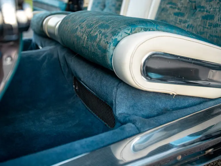 While there is some evidence of prior exterior paint correction, this Eldorado Brougham’s body panel gaps display original factory-built consistency throughout, and its brightwork and stainless steel roof remain dazzling. Its original interior materials are in similarly appealing condition, though the driver’s seat displays the expected signs of use. The car’s suspension air bags were replaced with conventional springs, a task believed to have been performed shortly after its initial sale—a common conversion due to the system’s complexity, even at the time—though the correct underhood air compressor is retained. Interestingly, the car rides on Cadillac Sabre wheels, rather than the Eldorado Brougham-specific design; Cadillac promotional and auto show photos on file depict a factory show car wearing these same Sabre wheels, and it is believed that they were installed on the car from new or while at the dealership.