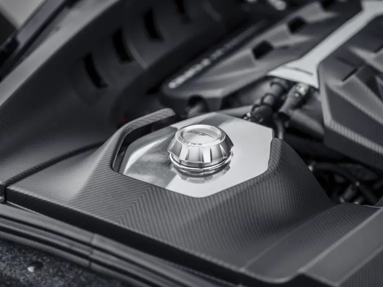 Prioritizing low weight and aerodynamic efficiency, the car’s bodywork ingeniously channeled air to its engine and brakes while maximizing downforce. Anchored by Brembo carbon-ceramic brakes with six-piston calipers and huge 15.5-inch rotors up front, the GT also employed hydraulic power steering, making for a race car that by every account provides feedback to the driver from the very first push of a pedal. Efficient architecture was so prioritized that the sport seats were fixed rather than adjustable, and the pedal box and steering wheel were designed to adjust around the driver rather than vice versa.