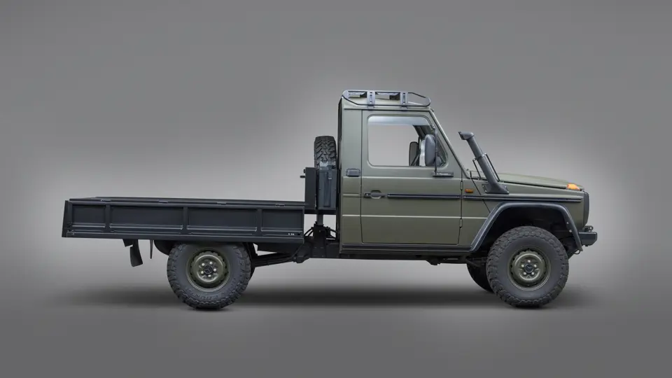 A spare wheel and metal jerry can are fixed to the rear of the cab, also showing a roof rack on top, and a snorkel around the front to aid air supply to the engine if wading through water. The steel wheels are painted to match the color of the cab and ride on knobby Toyo Open Country tires. The load bay can completely fold on three sides to serve as a flat bed. Inside the cab, the truck sports refreshingly simple design; wind-up windows either side and a sliding rear window let in light, the seats are finished in a shade of green to match the exterior, and a low-range, floor-mounted gear lever works alongside the manual transmission stick.