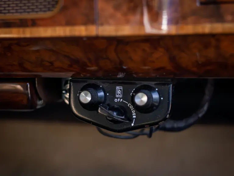 Believed to be one of just 11 PV23 examples equipped with left-hand drive, this Phantom V claims important ownership provenance while benefitting from a well-preserved older restoration. According to factory records on file, chassis number 5LVF49 was dispatched to James Young for touring limousine coachwork in May 1966. It was specified for the United States with instruments in miles and fitted with Dunlop whitewall tires, P100 headlamps, electric windows all around, a Hirschman electric antenna, pencil-beam rear interior lamps, a rear center armrest containing a mirror, notebook, and pencil, and a refrigerated mini-bar with decanters and glasses. Finished in “black number 1” paint and upholstered with beige leather in the driver’s compartment and beige cloth in the rear cabin, the Phantom V was dispatched for shipping in September 1966.