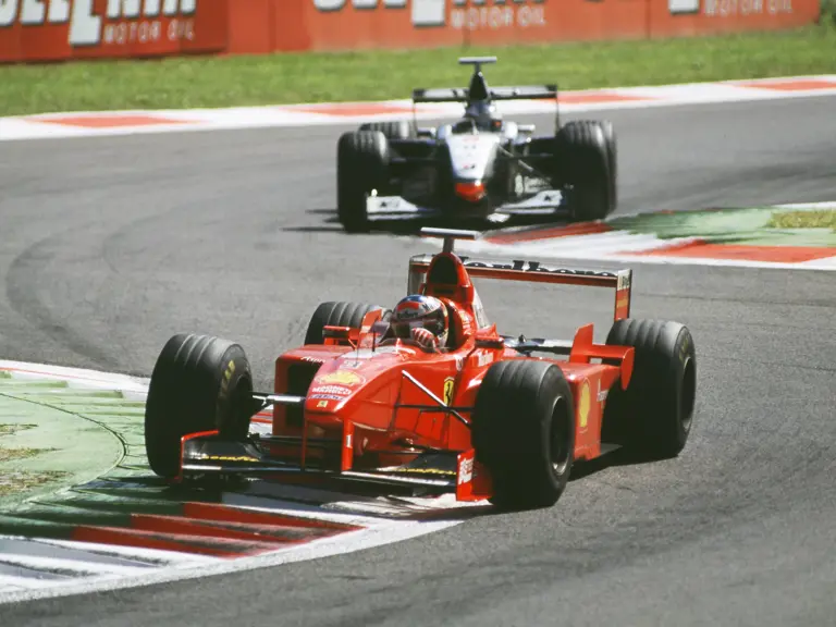 Fresh off a heated and controversial DNF result at the rain-soaked Belgian Grand Prix two weeks previous, Schumacher entered the subsequent Italian Grand Prix on 13 September just seven points behind Häkkinen for 1998 Drivers’ Championship. He qualified on pole, and promptly spoiled that privilege by stalling chassis 187 at the start. Building up from a mid-pack position, Schumacher battled up past Irvine and Jacques Villeneuve into 2nd behind Häkkinen. Just like their combat at the British Grand Prix two months prior, Schumacher pushed from behind the “Flying Finn,” forcing him to make a strategic error. On Lap 35, Häkkinen pitted for new tires (excessively worn trying to maintain a gap against 187’s fresher set), and Schumacher grabbed the lead during this 9.7-second intermission. Shortly thereafter, Irvine also passed Häkkinen, and moved up into 2nd place.