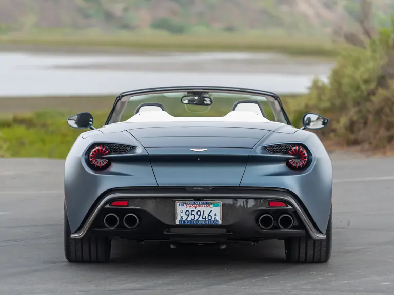 The following year, Aston Martin chose the Pebble Beach Concours d’Elegance as the stage for the Vanquish Zagato Volante’s global debut. Presented alongside the production Vanquish Zagato coupe, the drop-top Volante shares the bladed rear-end treatment and other styling cues that link it to the Vulcan supercar, while the wing mirrors draw from the One-77 supercar. Carbon-fiber lower sills remind those who catch a glimpse of this special Aston Martin that it is more than rolling art. Where the Volante differs compared to the coupe is above its belt line. The twin cowls integrated into its rear deck merge into the leading edge of the trunk lid. Hidden underneath is a special convertible top specific to the Zagato Volante.