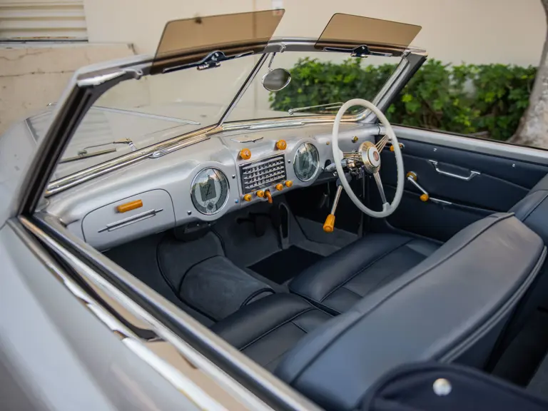 To ensure chassis 915683 would stand prominently even among other 6C Cabriolets, great care was taken in choosing the car’s striking finish of Grigio Chiaro Metallic. The light color accentuates both Pinin Farina’s iconic design and the incredible work performed by Rare Classics. Opening the door with its elegantly recessed door handle reveals a sumptuous bench seat trimmed in dark blue Touranil Vintage Leather. The crisp, polished instruments and amber-hued control knobs are complemented by light blue, square-weave carpet for a period finish, while a dark blue Happich canvas soft-top completes the stunning presentation.