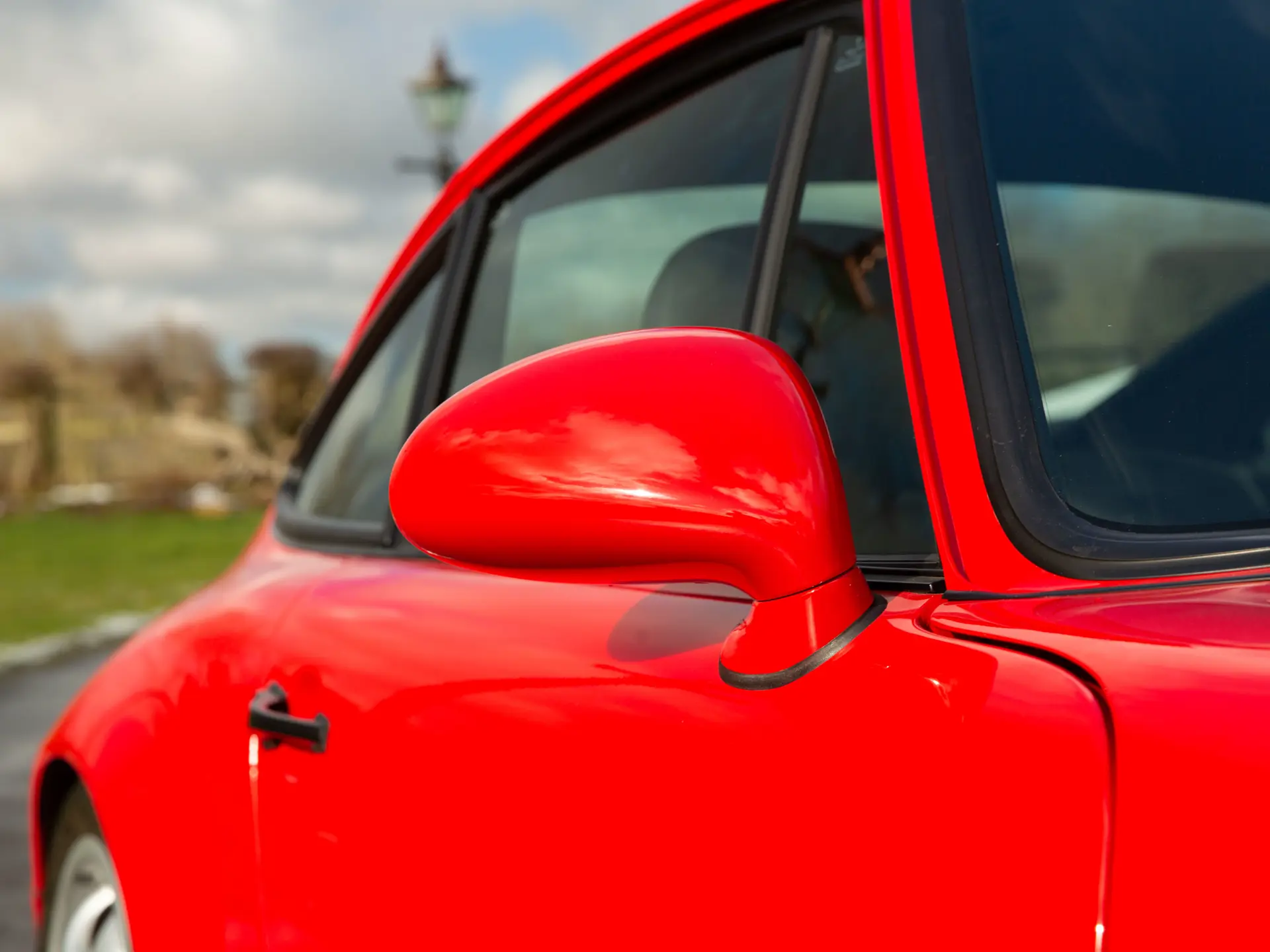 The consignor acquired this remarkably well-preserved Carrera RS in 2017 from Thomas Schmitz, leading authority on type 964 and 993 Carrera RS models and proprietor of German Sports Cars GmbH in Telgte, Germany. A service invoice for routine maintenance from Porsche Zentrum Münster dated 18 September 2017 and a corresponding stamping with mileage log in the factory warranty/service booklet indicate the mileage to have been 153 kilometers at the time. The consignor subsequently registered the Carrera RS in the United Kingdom and continued its regimen of fastidious care, accruing precious few miles.