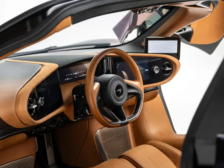 The model’s sleek, elongated bodywork, central driving position, adjustable multi-link suspension, and active aerodynamic systems epitomize McLaren’s focus on delivering an unforgettable drive. Altogether, these remarkable elements expertly fuse design and technology to produce an experience unlike anything else on the road. Those who crave even more excitement can explore the Speedtail’s “Velocity Mode,” which upon activation lowers the suspension by 1.4 inches, changes the aerovane configuration, and retracts the side-view cameras, thereby streamlining the car’s silhouette for enhanced stability at high speeds.