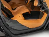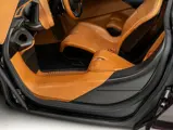 Moving onto number 85’s exterior finishes, the brake calipers were specified in standard black paint and are housed within 10-spoke gloss black lightweight wheels. Concealing those at the front axle are distinctive, aerodynamic “speed covers” fashioned of 1,000-strand, exposed gloss carbon fiber perfectly color-matched to the car's ground effects, which subtly contrast with the rest of the MSO Violet bodywork. The car’s exterior badging is handsomely rendered in machined aluminum, though the Magnetite waist rail beneath the engine cover is certainly a contrasting highlight worth pointing out. The exhaust, neatly integrated into the rear diffuser and nearly hidden from view, is finished in Stealth titanium.