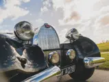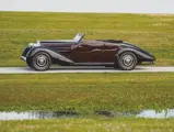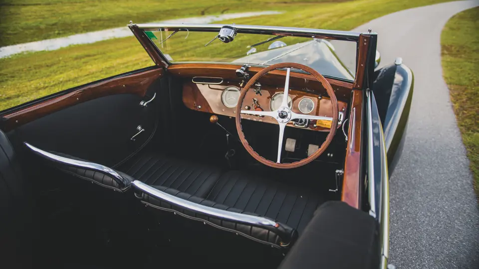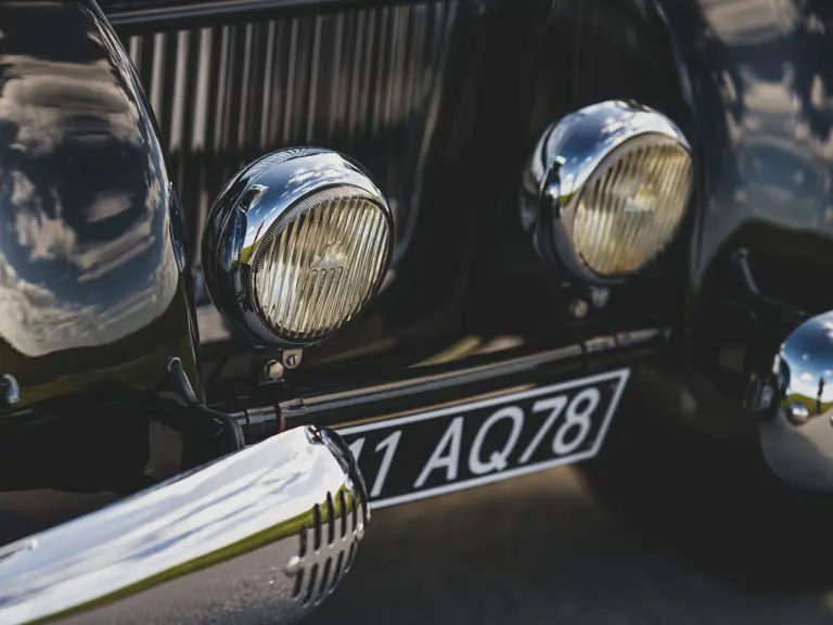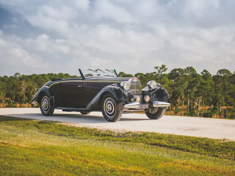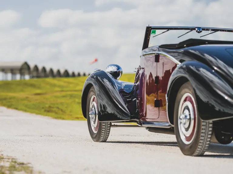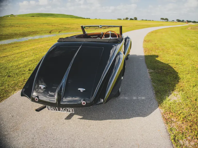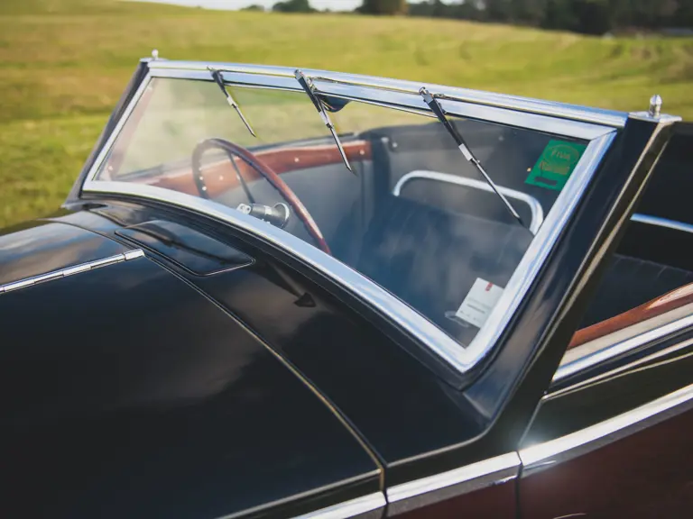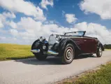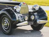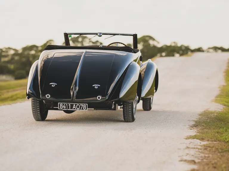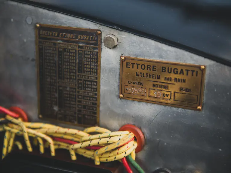 Chassis number 57589, offered here, was completed at Molsheim in September 1937 and delivered in March 1938 to the revered Belgian coachbuilder D’Ieteren on behalf of a customer named Baggage, with a special notice for “urgent delivery.” Only four Type 57s were ordered with D’Ieteren coachwork in 1938, but this would be the only example finished in this Aravis-inspired style, developed with significant input from the impatient Monsieur Baggage himself. The customer was particularly tall, resulting in the somewhat stretched proportions of the cabin, sheltered by roll-up windows and a streamlined, folding canvas top that was particularly low and sleek in either the raised or lowered position. It was and remains a stunning automobile, with a truly elegant and distinguished character.
