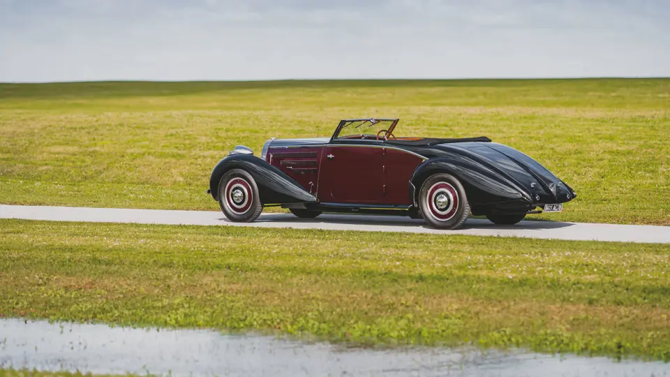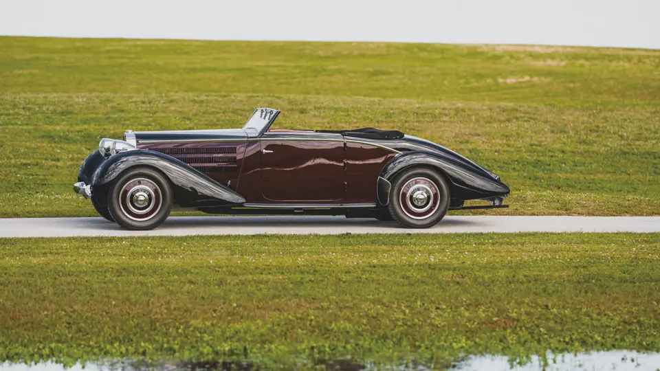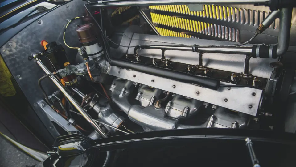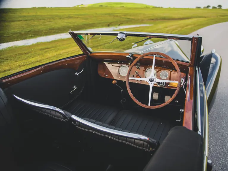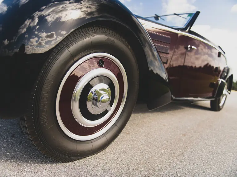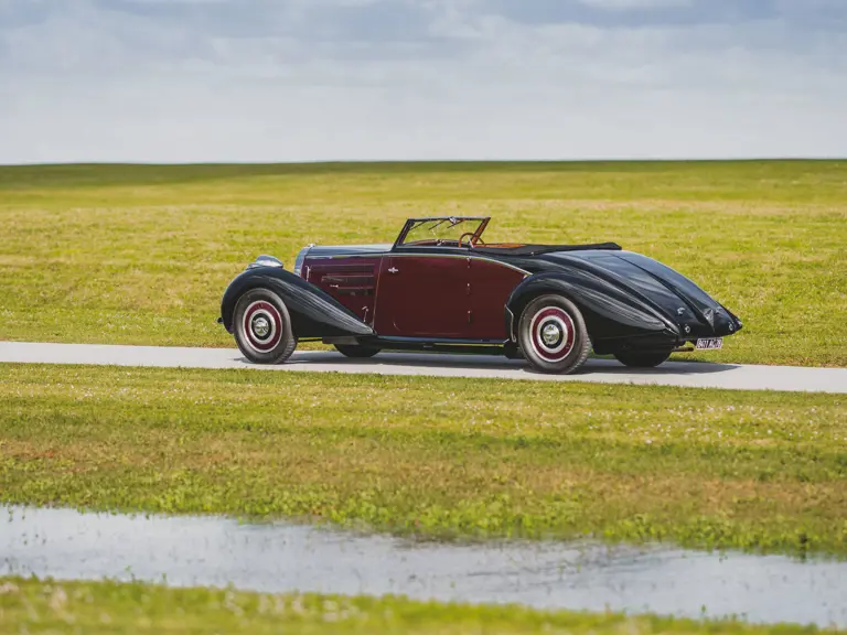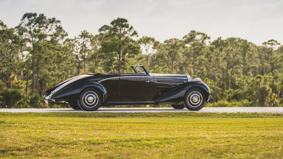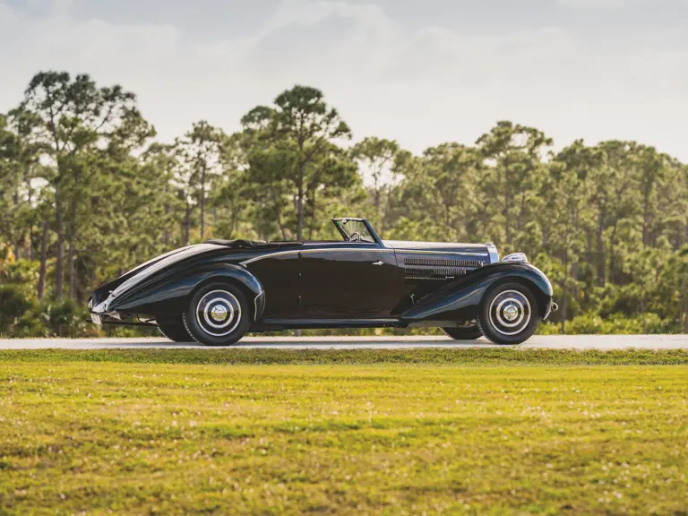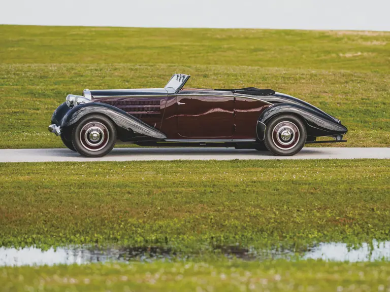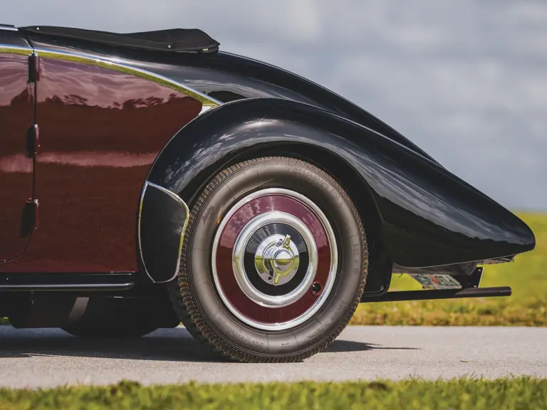 This exceptional car retains most of its original factory components, including its twin-cam straight-eight engine, the original chassis frame, and the exquisitely sculpted D’Ieteren coachwork, a genuinely one-off design inspired by one of the factory’s finest creations. It is documented with restoration invoices from Jim Stranberg, Pichler, and Scott Sargent over its prior ownerships, as well as various historical documents. Most striking of all are a D’Ieteren photo album, including period images, and sets of both tools and unrestored original luggage.