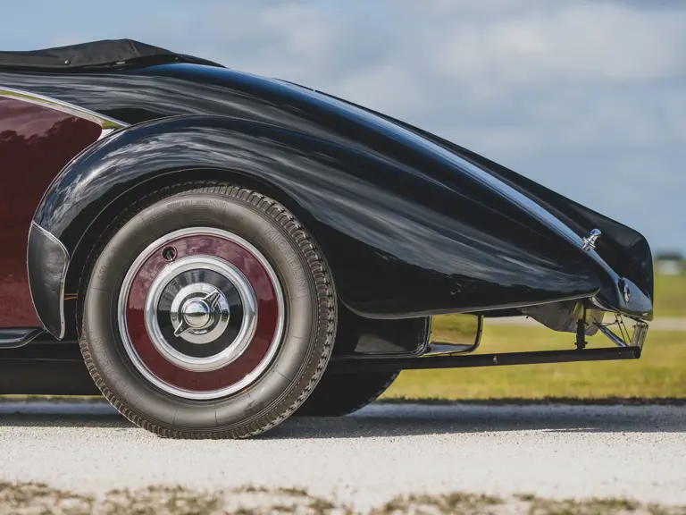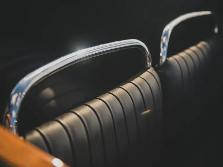 In September 2015 the Bugatti was acquired by a respected Florida-based collector. The car was examined for him by noted specialist Scott Sargent, who noted that the Type 57 retained numerous original components and details, such as the firewall and remnants of original paint on the undercarriage that lent the car a definitive and irreplaceable authenticity. Consequently, to retain the utmost originality, it was decided to limit any restoration to cosmetic considerations and service of the original mechanical components as needed. The interior and top were retrimmed, while the unique coachwork was refinished in a very attractive and distinctive two-tone scheme of black with maroon details.