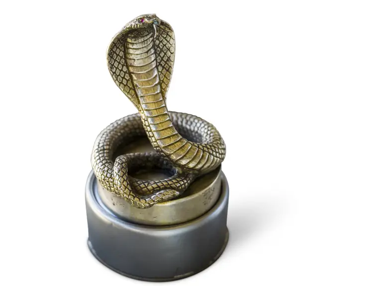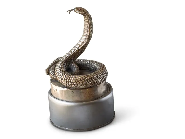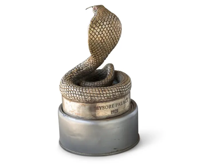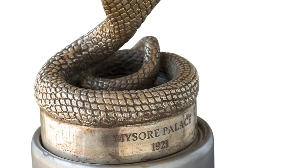 This mascot is believed to be from a Maharaja car. It has ruby eyes and a Mysore Palace engraving.