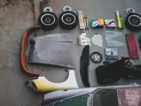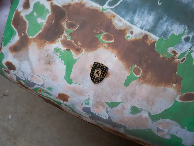 What comes with this lot is the ’68 L, a ’69 S 2-liter long-block, an early 901 transmission, an early Scheel seat, replacement dash, great patinaed decklid and front hood, great right-side fender, a fiberglass S bumper, rear bumpers, louvered vented windows, perforated floor pan footrests, four Minilites, some brake rotors, some Bilstein shocks, and let’s not forget, my own Nike 277 SB Dunks. But there’s more than that. I’m also throwing in my own signature MOMO steering wheel, complete with the outlaw horn button.