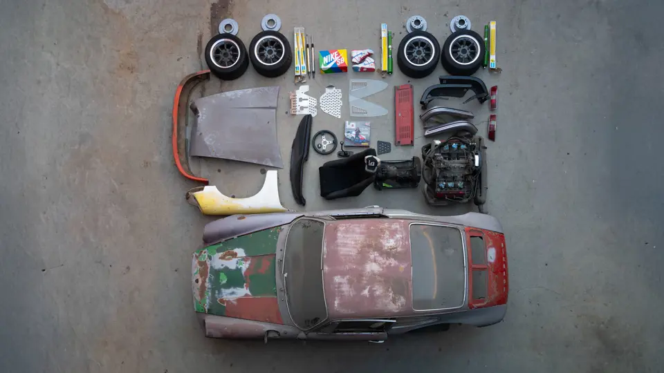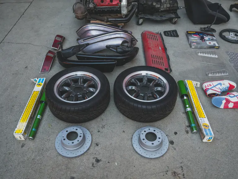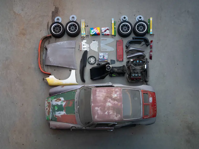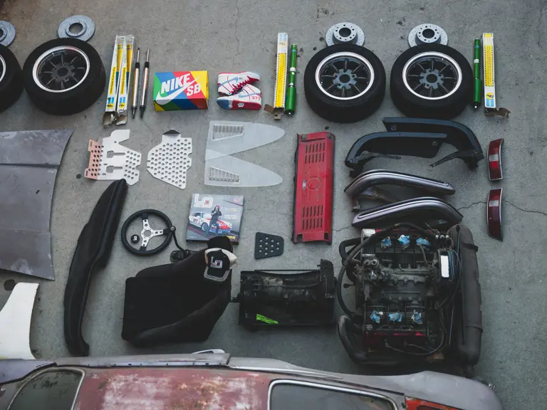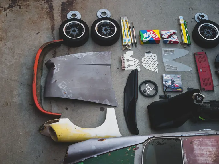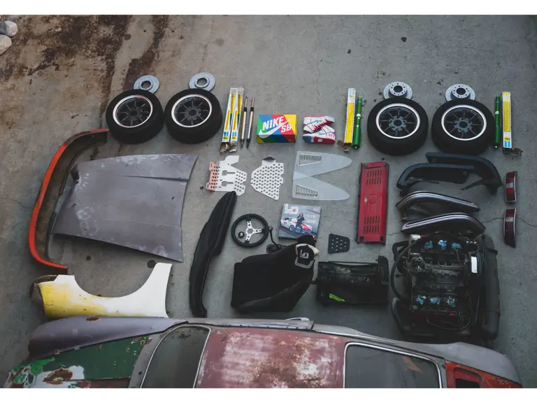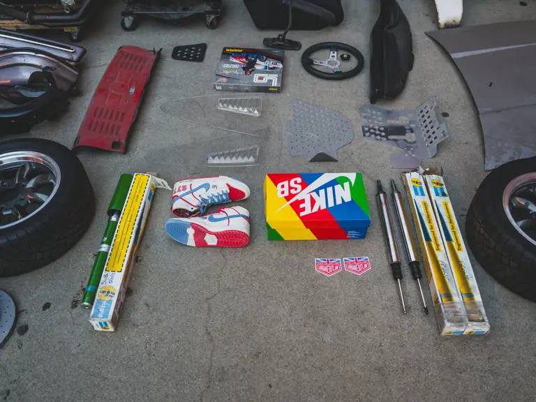 Of course, having all the bits and pieces on hand is only one part of the equation: A clear creative vision, and yes, additional components and plenty of work, will be required to see this project through to completion. For inspiration, a Magnus Walker Special Edition MOMO Prototipo steering wheel, as well as Nike SB Dunk “277” sneakers and an Urban Outlaw hat and stickers, are all part of the kit.
