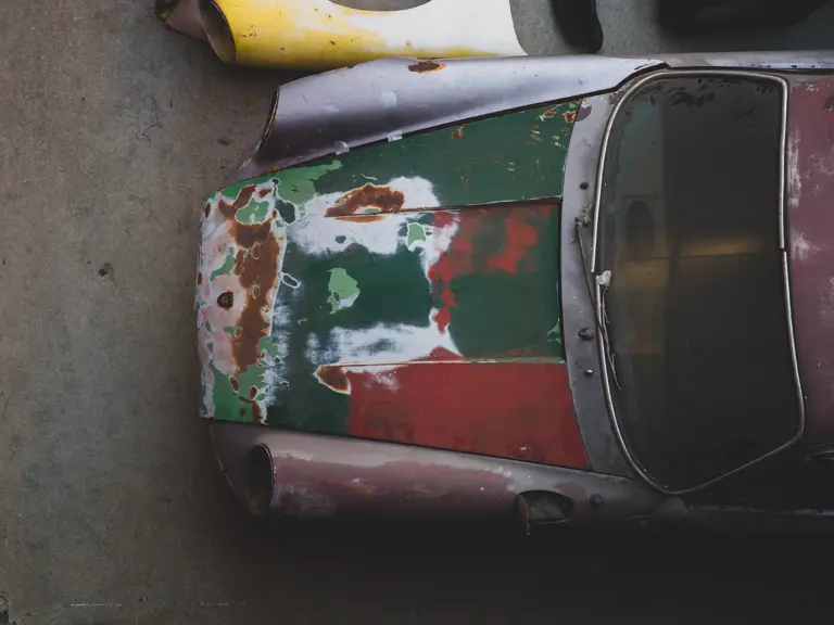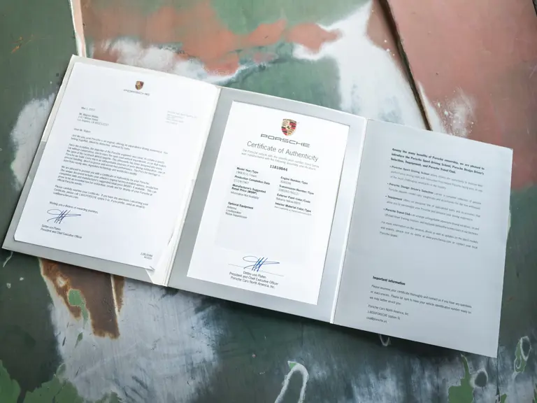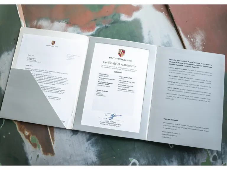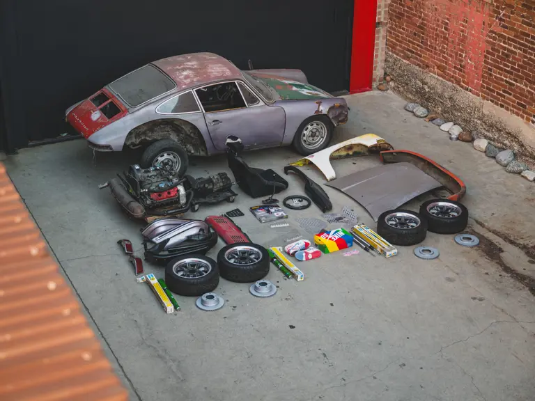 The core of the kit is a 1968 911 L coupe, chassis number 11810044. Per its accompanying Porsche Certificate of Authenticity, it was completed on 19 July 1967; a Kardex copy on file notes it was originally delivered to Wenningstedt on the German island of Sylt, a popular vacation destination. It was originally finished in cheerful Bahama Yellow, though little of the original paint has survived to the present. Components from Walker’s collection, including a rear decklid, additional hood, right rear fender, rear body panel, and a fiberglass 911 S front bumper, round out the supplied bodywork. The car could be completely repainted, or the honest patina of pieces like the hood and decklid could be selectively preserved—the choice is yours.
