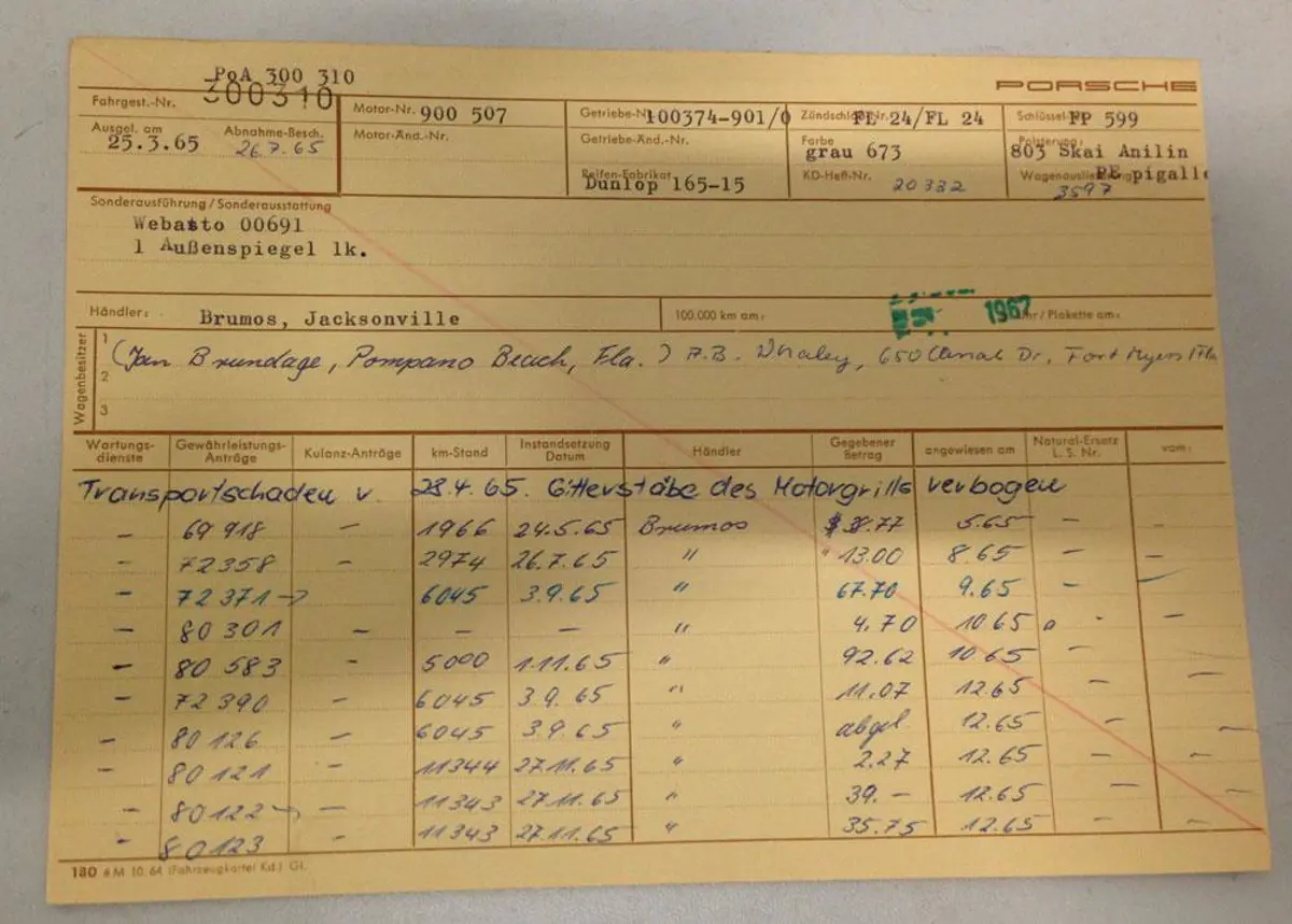 It is hardly surprising, then, that Brumos would be one of the very first firms to offer the brand-new Porsche 911 to its eager American clients. This 1965 911, chassis number 300310, is not only among the earliest examples of the model produced; it is also understood to be one of the first half-dozen cars imported via Brumos. Completed in early 1965 and factory-finished in Grau over a leatherette interior, Jan Brundage, son of Brumo founder Hubert Brundage, is actually noted as the first owner on the accompanying Kardex copy. However, the car soon passed to a resident of Ft. Meyers, Florida, with the Kardex noting consistent service over the following years.