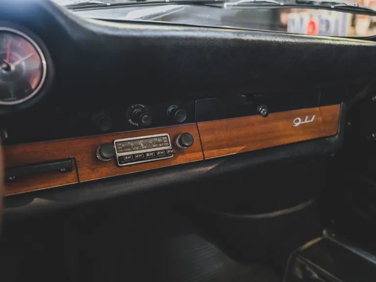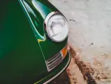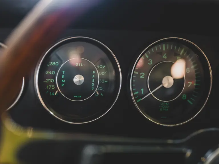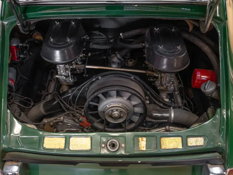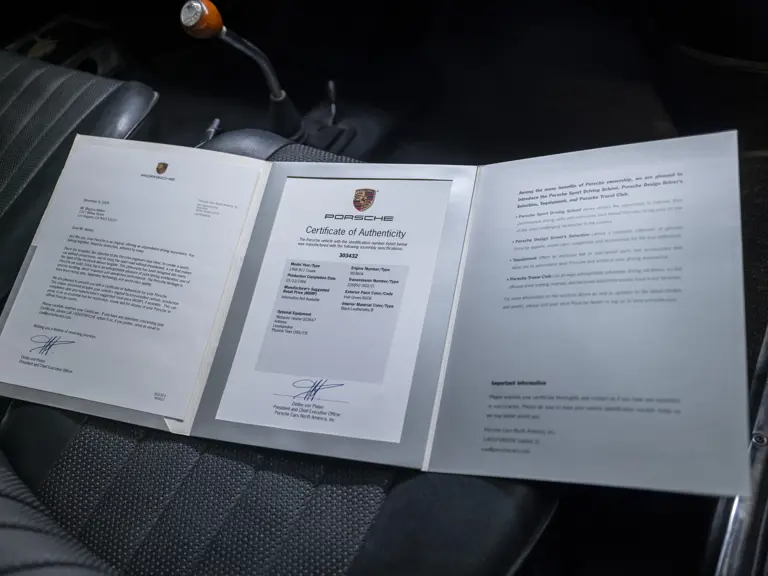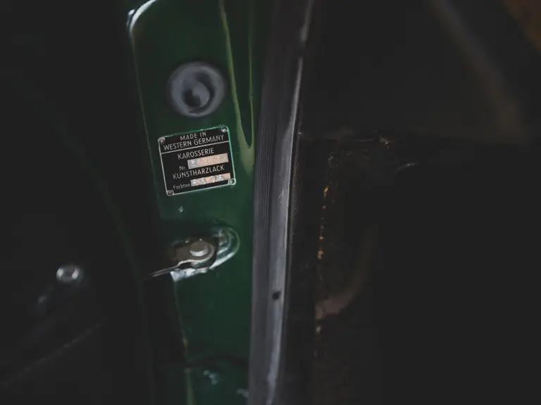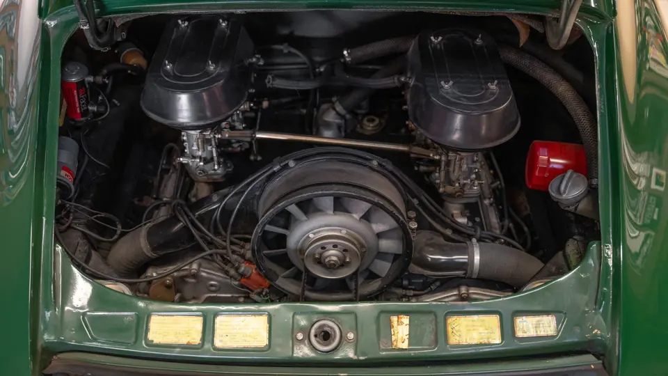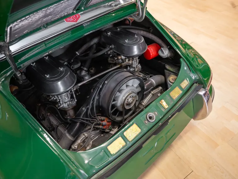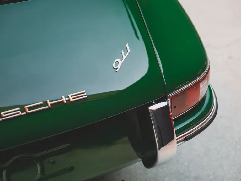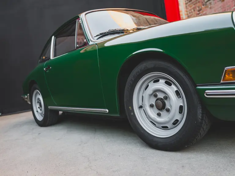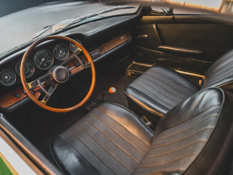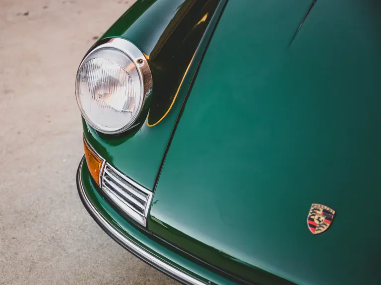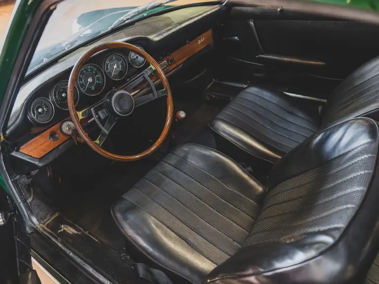 When Walker acquired the 911 in 2009 following a lightning trip to the Pacific Northwest, it remained much as it was when it was first delivered. It wears a repaint in its factory-correct Irish Green and retains its numbers-matching flat-six (it is currently fitted with an earlier type 901/0 gearbox numbered 100717). The original Black leatherette interior, original carpets, and wood-rimmed steering wheel boast the authentic patina that comes only from years of careful use. It still rides on the gray-coated steel wheels, sans hubcaps, installed by Walker after his purchase.