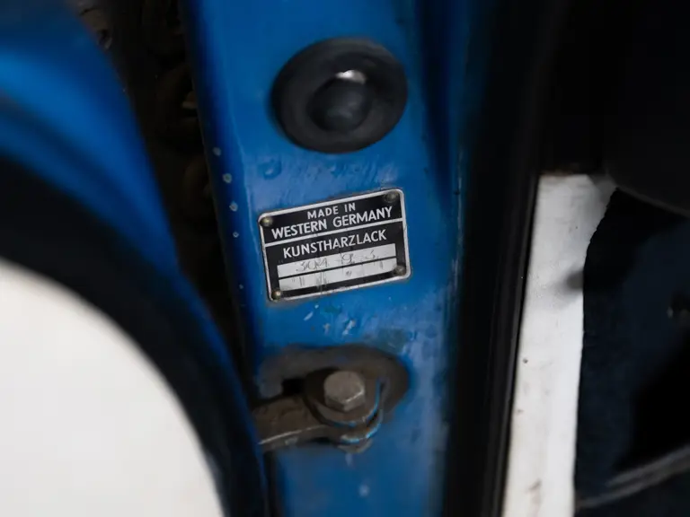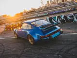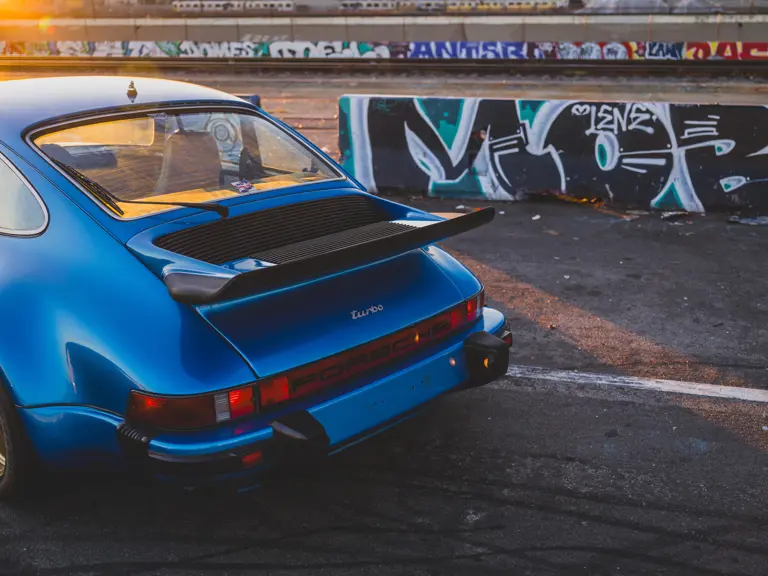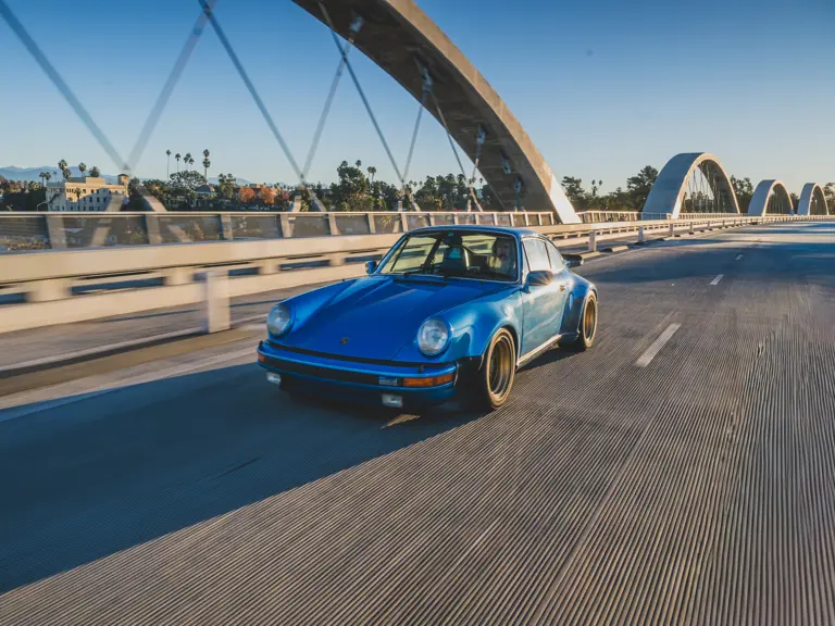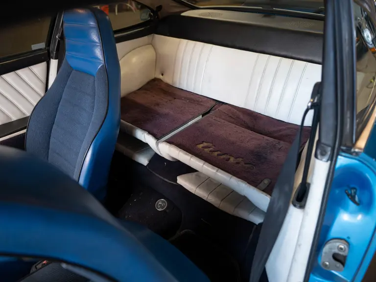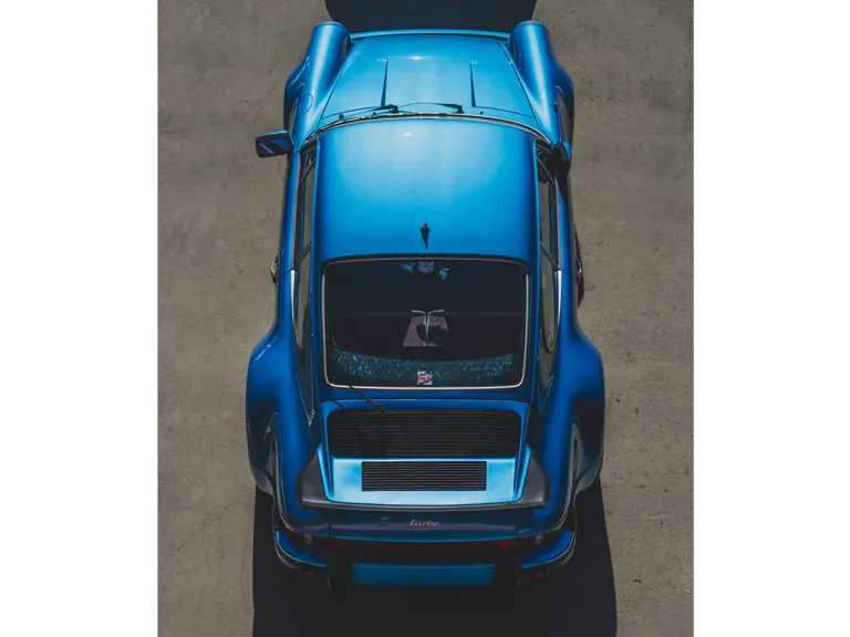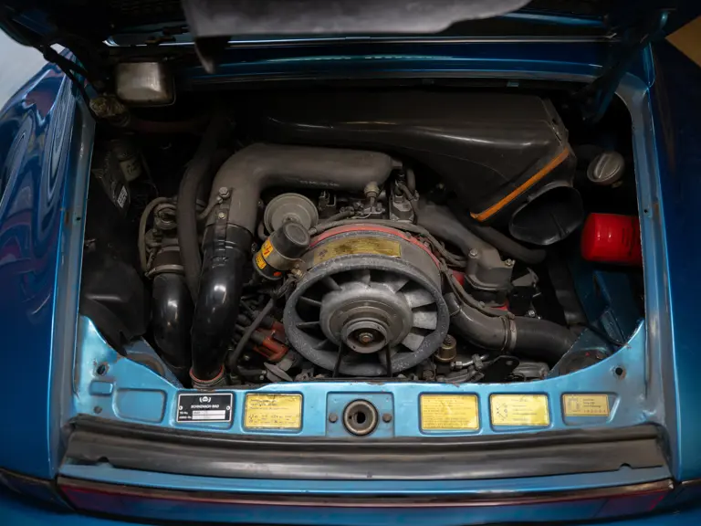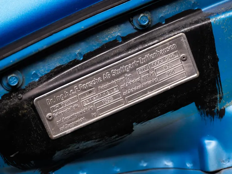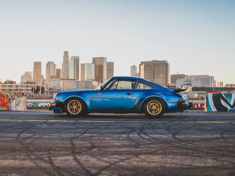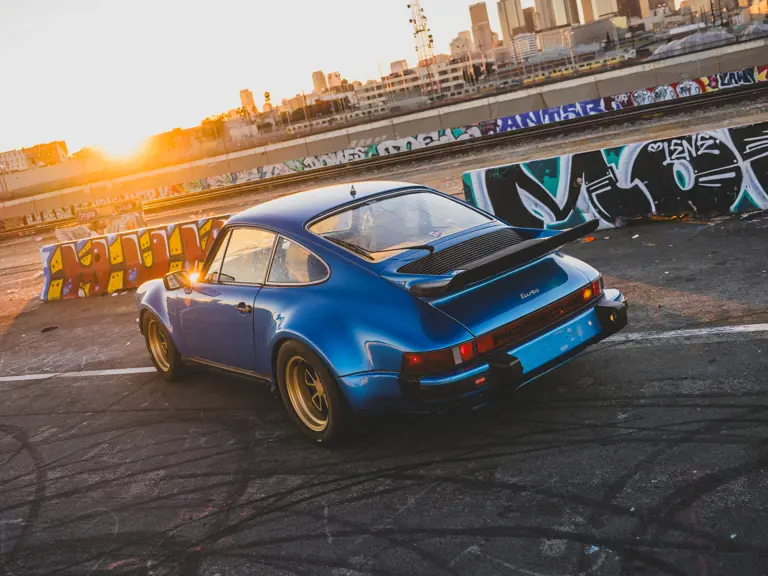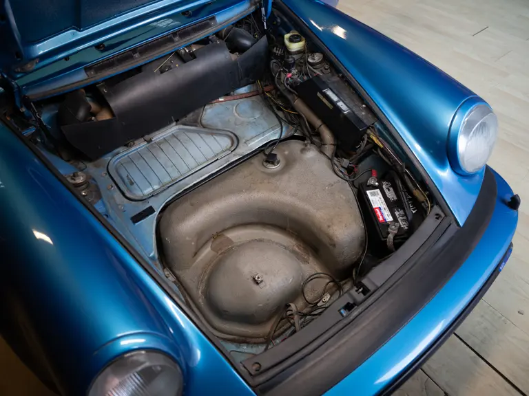 Acquired by Magnus Walker in 2013, the Porsche has been a fixture of his collection since; as expected, it features a number of personal touches culminating in an aggressive Outlaw-style 930 Turbo. The deep-dished Fuchs-inspired wheels built in collaboration with Fifteen52 are fitted in a staggered setup with 225-50-15 up front and 245-45-50 at the rear with meaty Hoosier R6 rubber. This package, combined with a lower ride height, fills the widened fenders exquisitely to create a silhouette reminiscent of the race-born Porsche 934. The bodywork has been finished in a close variation of the original factory Minerva Blue Metallic, which pairs beautifully with the gold-bronze wheels—which are, in fact, the very first wheels of their kind produced. Per information supplied by Porsche expert Jürgen Barth, it retains its numbers-matching 3.0-liter engine.