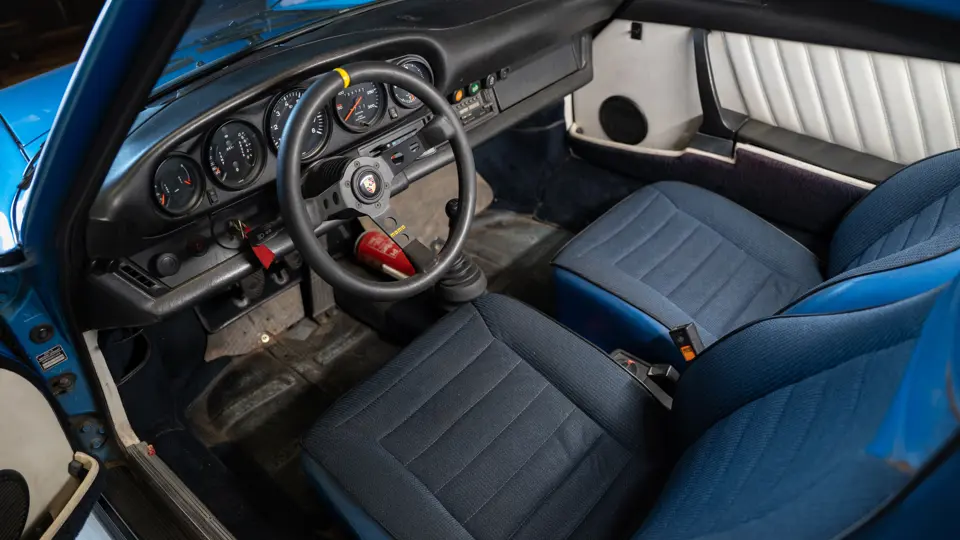 Equally visually appealing is the interior, thanks to the fitment of blue seats covered in leather and corduroy sourced from Walker’s 1978 911 “78SCHR.” Having been delivered from the factory with a fully white leather interior, the contrasting furniture looks right at home, adding a truly unique and tactile element to the cabin space and is so clearly born from a mind with an eye for fashion and textiles. Lastly, a Momo Mod.7 steering wheel provides a purposeful contact point for the pilot of this turbocharged Porsche.