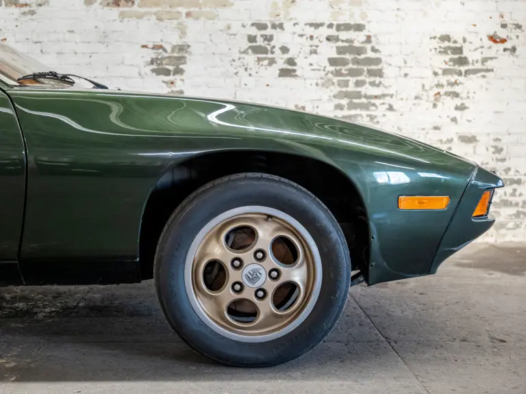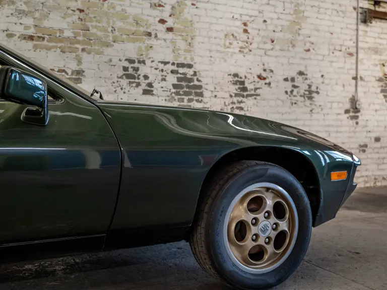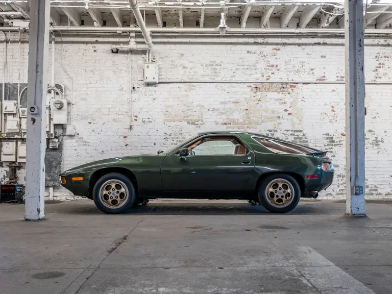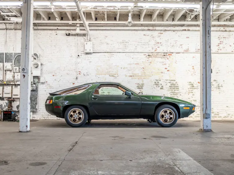 This 1978 928 is the first 928 I ever purchased, about ten years ago. It is in this awesome color of Oak Green Metallic, sunroof delete, five-speed manual, rolling on bronzy gold phone dial wheels, with this sort of peanut butter tan interior. It is a really underrated car.